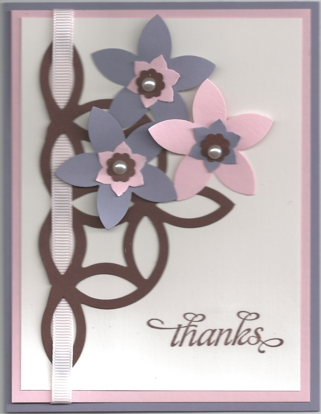 - I used Chocolate Chip card stock and ran it through the Big Shot using the Lattice die. I then trimmed off part of the die and threaded my Pretty in Pink Grosgrain Ribbon through the die cut. I attached the die cut to the Whisper White card stock.