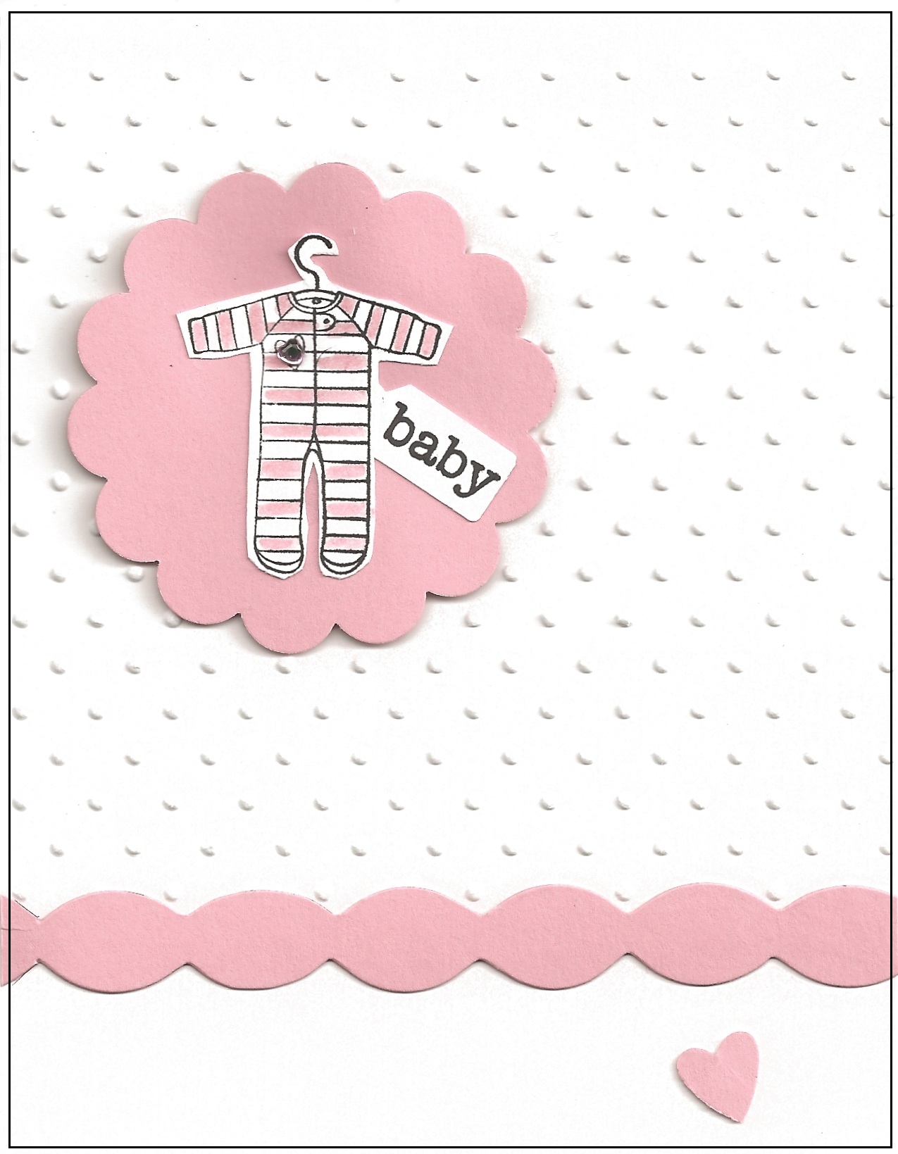 - I stamped the onesie in Black Staz-on on Whisper White card stock, cut it out, and used the Blushing Bride Marker to color in the stripes. I placed a rhinestone on the heart of the cut-out onesie.