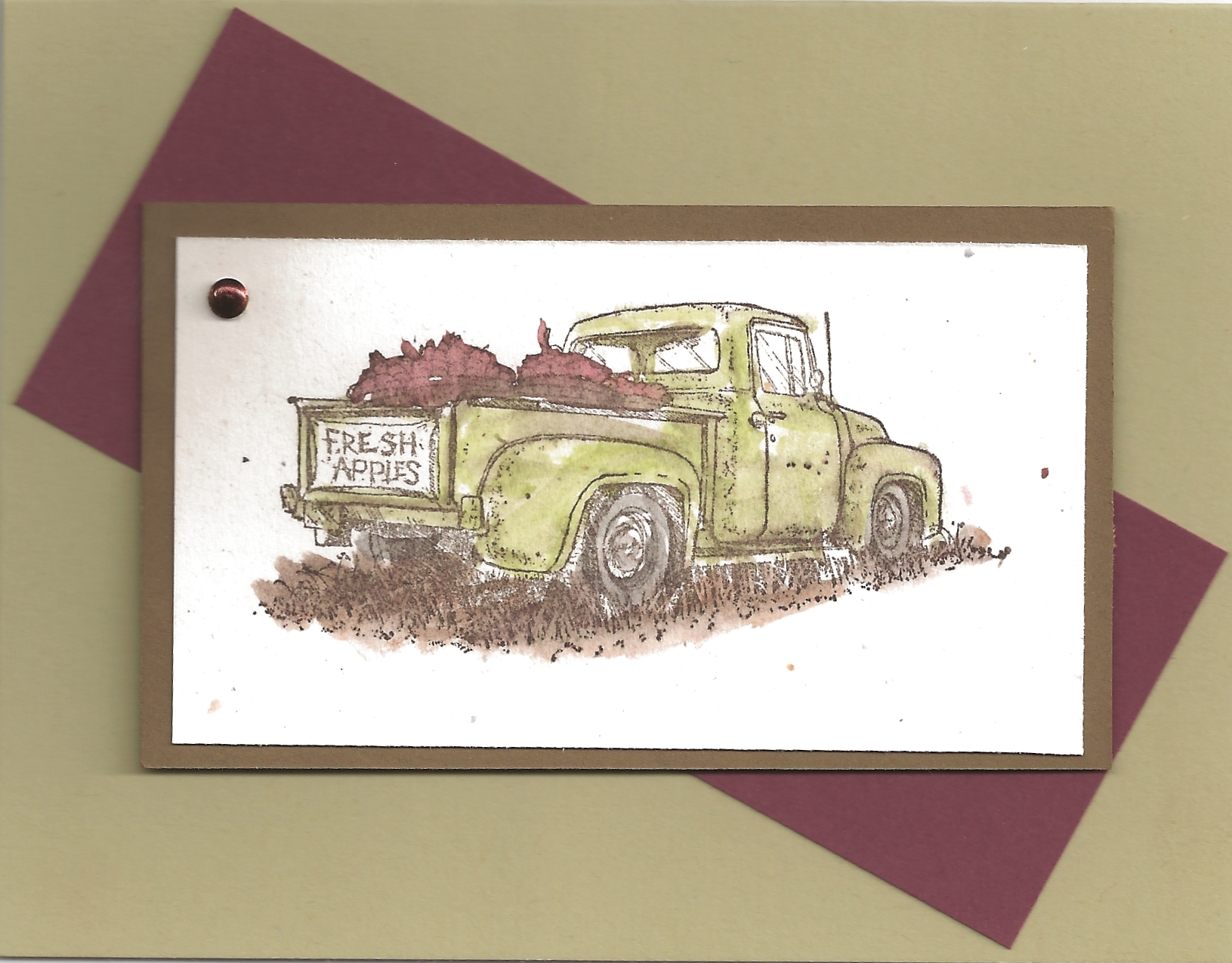 - Attach your stamped image to Soft Suede card stock. Insert a brad at the upper left-hand corner.