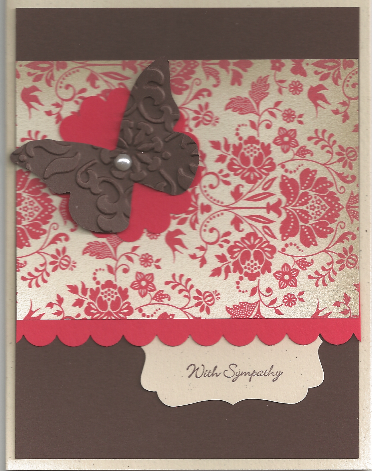 - The Big Shot came out next. I used the Beautiful Butterflies die and cut out one of the butterflies from that die using Early Espresso card stock. I embossed the butterfly with the Vintage Wallpaper Embossing Folder.