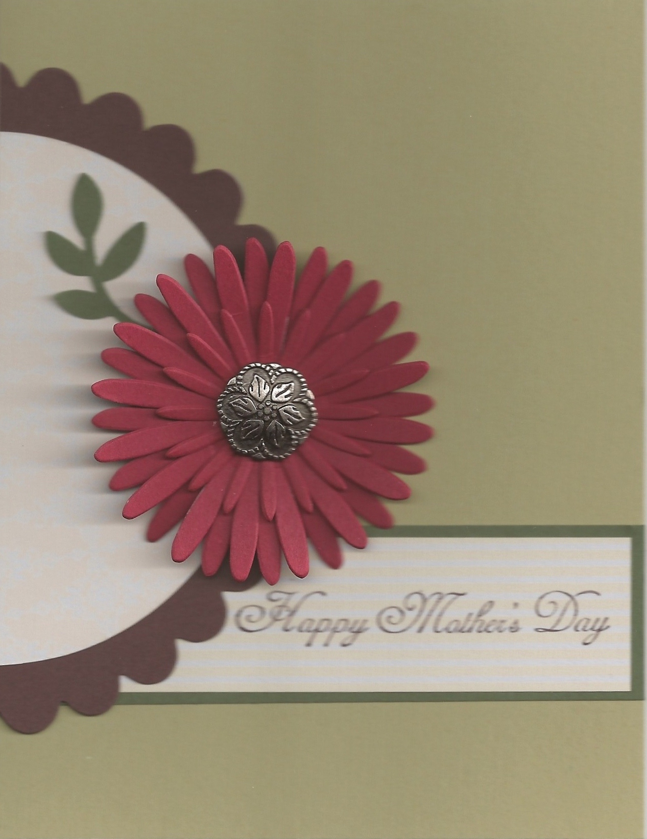 Well, I had to wait until after Mother’s Day to post my card. I CASE’d this card from another wonderful demonstrator. (Sorry I can’t give credit for the design to the original demo. I simply couldn’t find who it was.) I modified her design to work with my colors and the Big Shot dies I own. I used the Daisies #2 die on this card, which is on the Retiring Accessories List. It’s still one of my favorites for flowers!