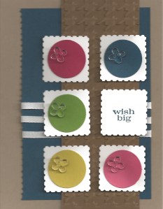 Sorry I have been missing in action for the last week. I was diligently working on the projects for my 10-15-20 Camp using the retiring stamp sets and accessories. Everyone who attended left with 10 cards, a little gift and, of course, the new 2012-2013 Stampin’ Up! catalog.