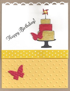 I’ve been diligently working on finishing up leftover already-cut cardstock from all of my previous Stamp Camps and Card Buffets. Some of you might recognize the layout on this card. The original was an anniversary card with hearts and love birds on it. I decided that my stockpile of those type of cards was sufficient, so I pulled out my new stamp set, Make a Cake, and thought I would go with a birthday theme.