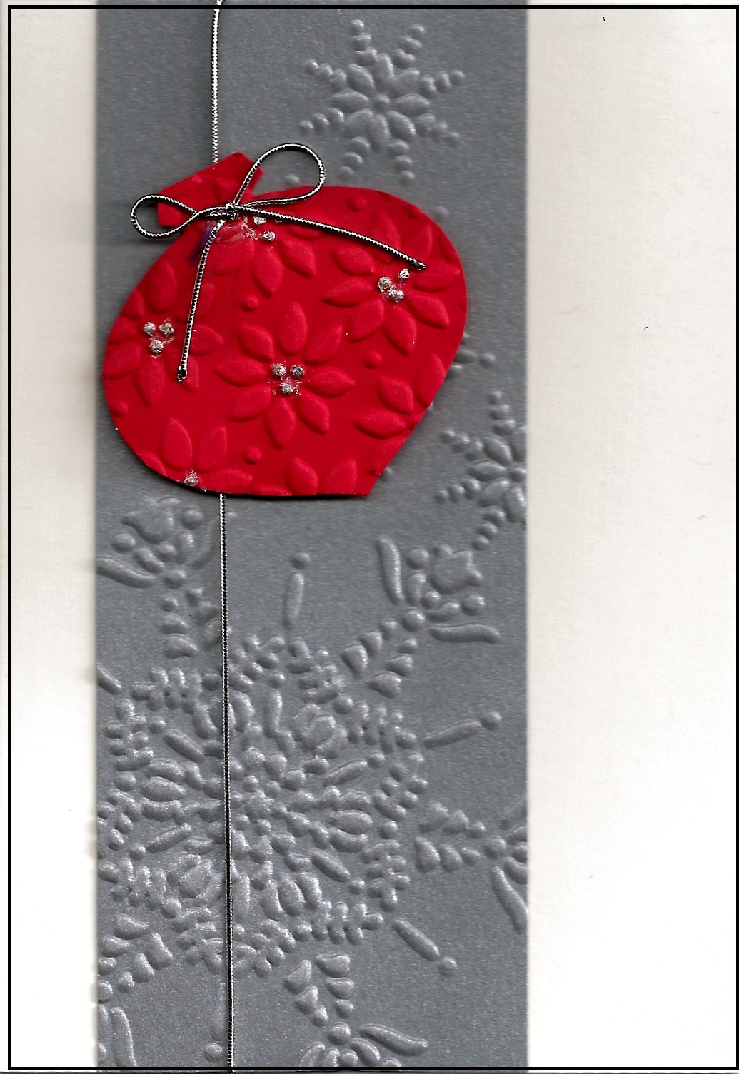 This card went together quickly. I had these punched ornaments left over from a project last Christmas. I added a piece of Brushed Silver card stock that I ran through the Northern Flurry Embossing Folder. I added the ornament that had been punched out of Real Red cardstock, run through the Petals-a-Plenty Embossing Folder, added some glitter to the flowers, and tied a bow of silver cord. I added a longer piece of cording to the silver card stock and placed the ornament on top using Dimensionals.