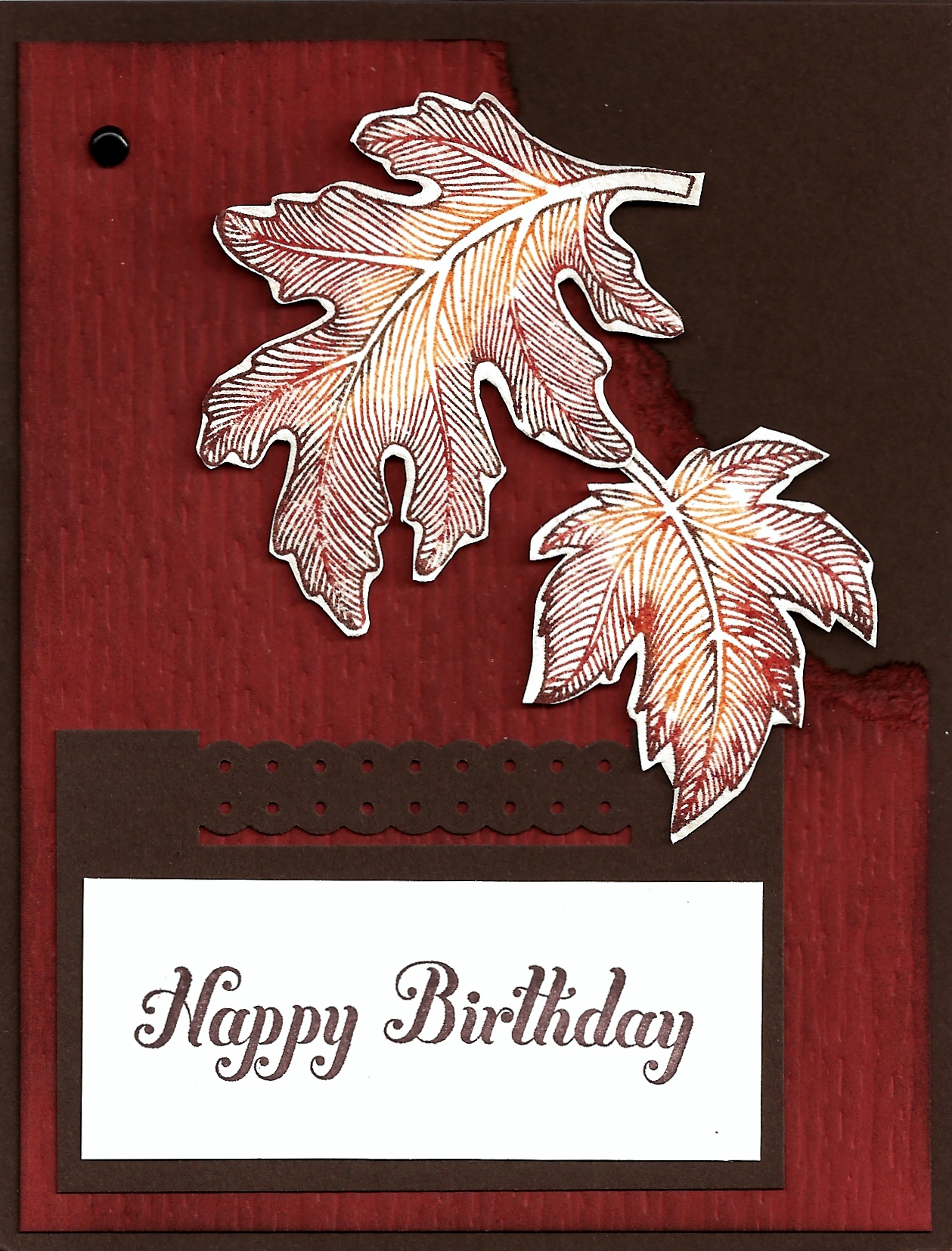 This card was made using one of the retired Stampin’ Up! texturz plates on Cajun Craze card stock to achieve a grain type texture to the card. Our new Woodgrain Embossing Folder will do the trick now. The card base is Chocolate Chip card stock with the Cajun Craze layered on top, after being torn and then sponged with Chocolate Chip ink to give it a more “woodsy” feel and inserting a brad for fun. The Dotted Scallop Ribbon Border Punch was punched just once in the middle of the Chocolate Chip rectangle to add a bit of interest, and then Happy Birthday was stamped on Very Vanilla card stock and layered on the piece. The leaves were stamped on Very Vanilla card stock using three different colored markers, coloring directly on the rubber stamp. They were then cut out and attached with Dimensionals.