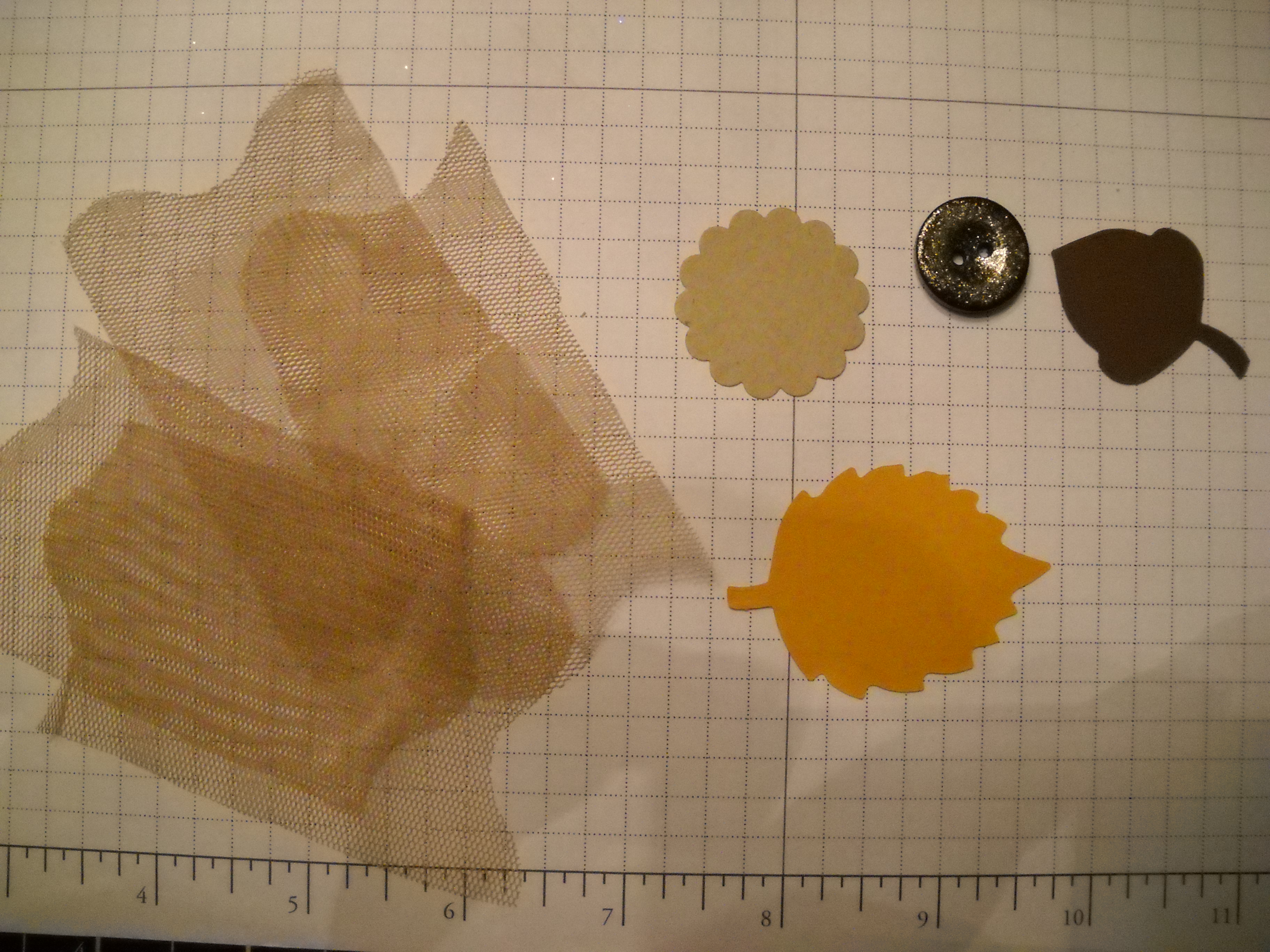 I started off with an 8″ piece of Stampin’ Up!’s 3-1/2″ Crumb Cake Scalloped Tulle Ribbon cut in four 2″ pieces. I ran a piece of More Mustard and Chocolate Chip card stock through the Big Shot using the Autumn Accents die for the leaf and acorn. I punched the 1-1/4″ Scallop Circle from Crumb Cake card stock. All of these items are in our Holiday Catalog. The buttons are from the Neutrals Designer Buttons pack.