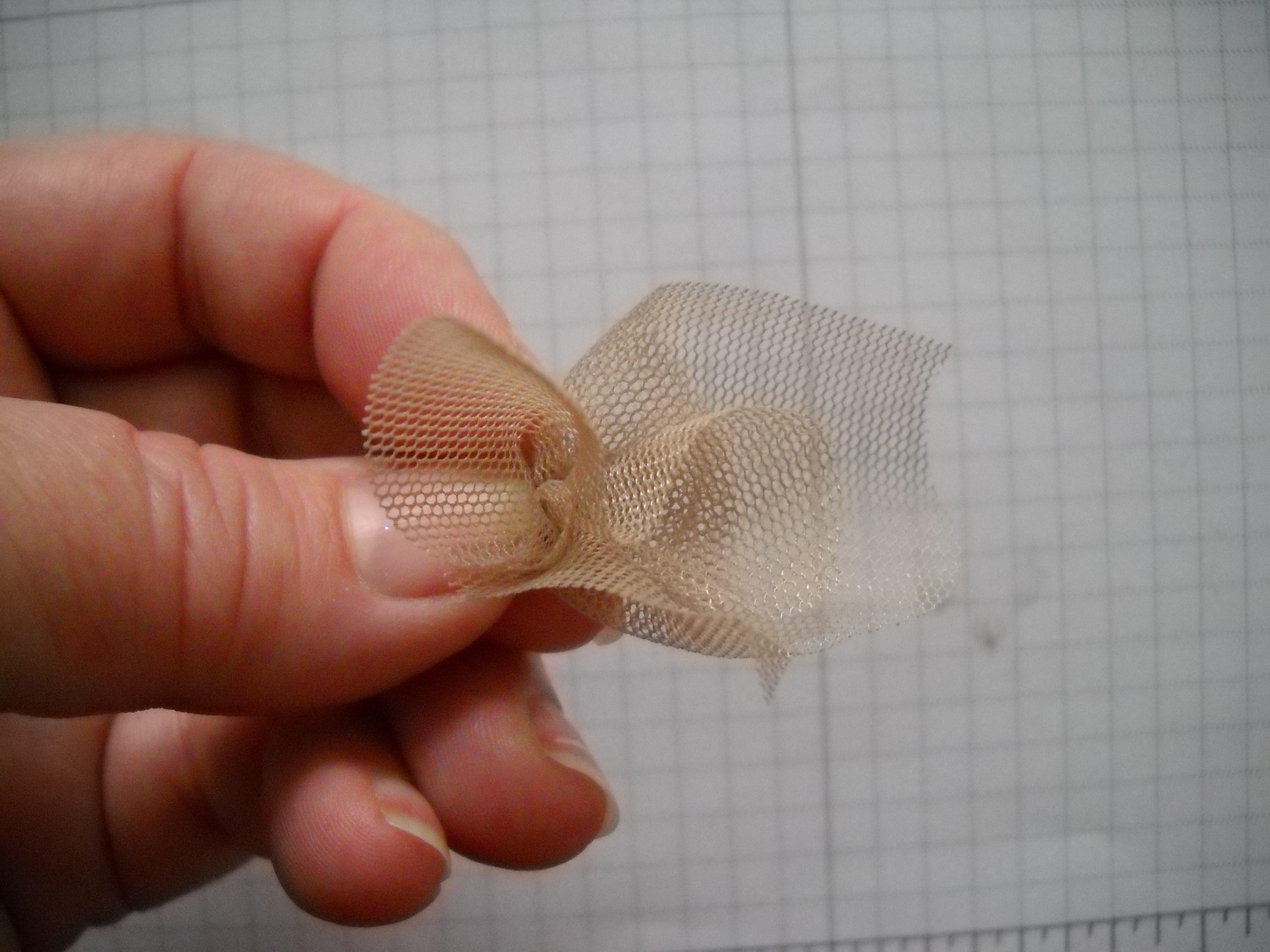 Next I took my 2″ piece of tulle and stuck my finger in the middle of it and kind of twisted the end to make a ruffled piece.