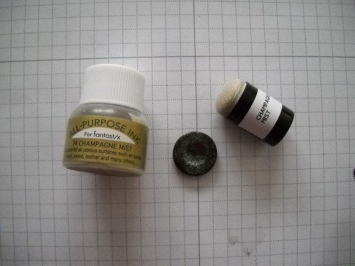 I took our Champagne Mist Shimmer Paint, using a Sponge Dauber, and painted my button. I wanted a more subtle look. I set the button to the side to dry. If you are in a hurry, a blast from the heat gun works well. As you can see, I label my Sponge Daubers with the ink or paint I have used them on.