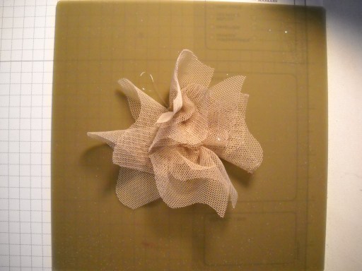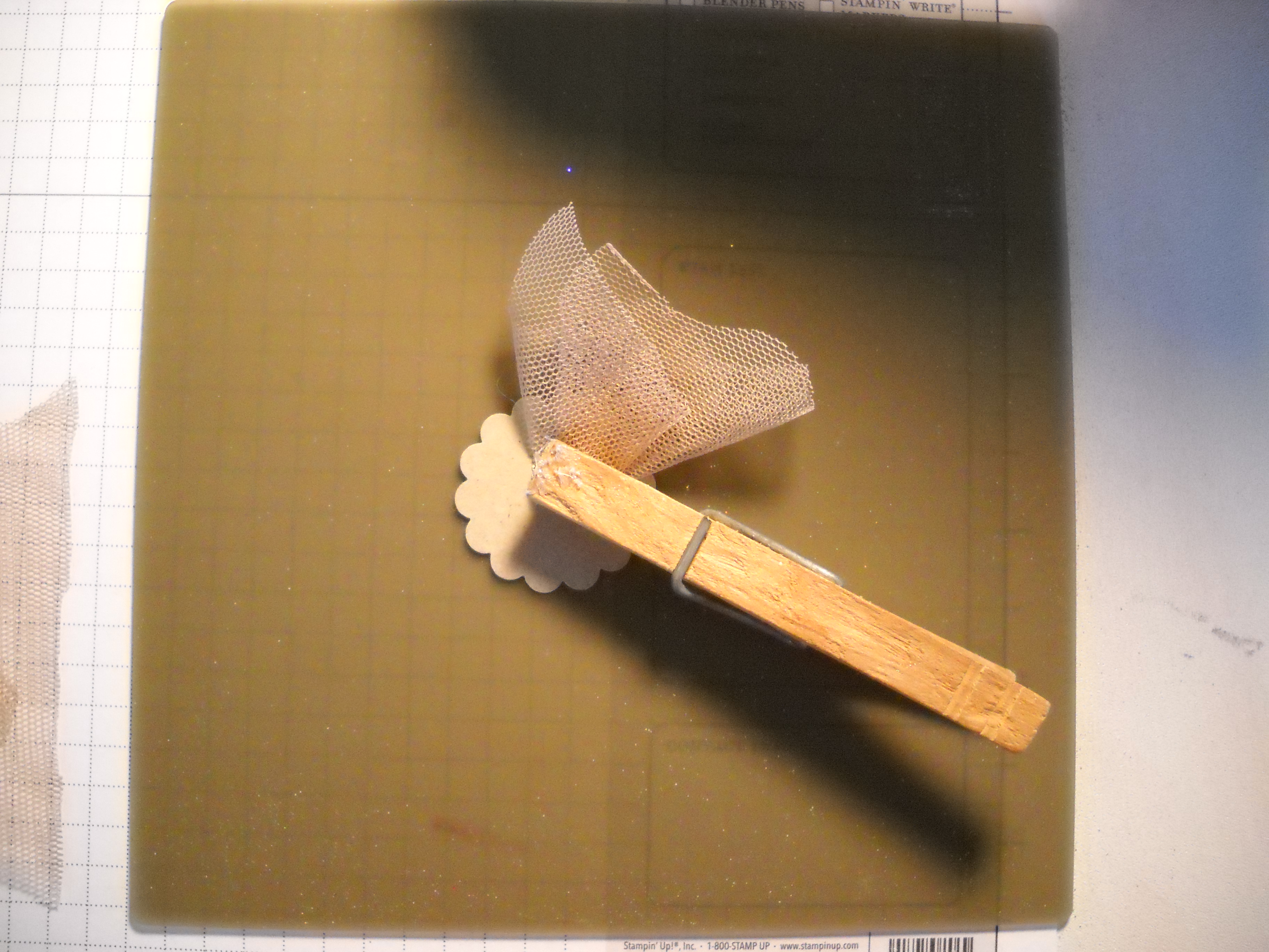 I placed my scalloped circle on the Silicone Craft Sheet and attached my tulle piece using my glue gun, holding it down with my clothespin for a few seconds to allow it to stay put. I then added the other pieces of tulle to the scallop circle.