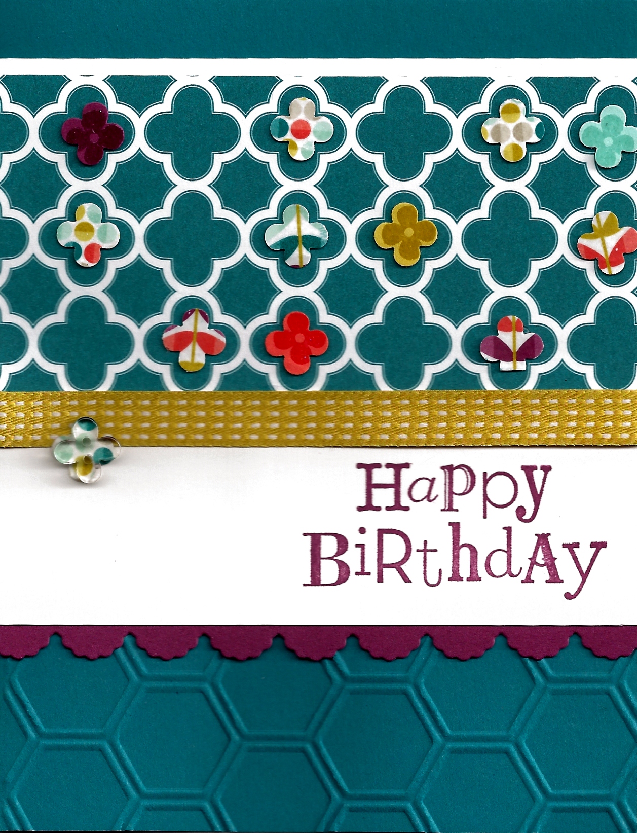 Now comes the fun. I took a small piece of the Sycamore Street paper using two different designs and covered them with Versamark and embossed the entire piece with Clear Embossing Powder. I punched out different areas using the Itty Bitty Shapes Punch Pack. I also stamped a flower in Versamark from the Itty Bitty Bits stamp set on Summer Starfruit, Rich Razzleberry, Pool Party and Tangerine Tango card stock, embossing them again with Clear Embossing Powder and punching them out. They were attached randomly to the Designer Series Paper on the card.