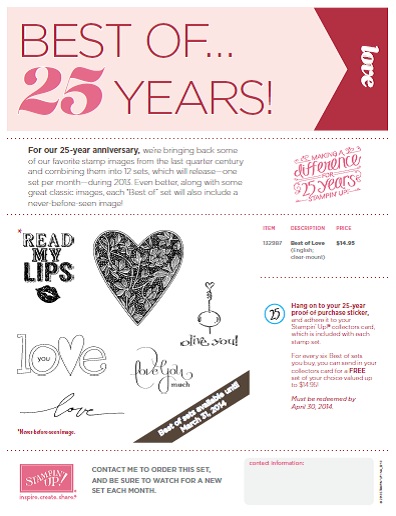 As a special incentive to collect the “Best Of” stamps, Stampin’ Up! is including a collector’s card and a 25-year proof of purchase sticker with every “Best Of” set. Collect six stickers and send it in to redeem a FREE set of your choice valued up to $14.95! Free sets must be redeemed no later than April 30, 2014.
