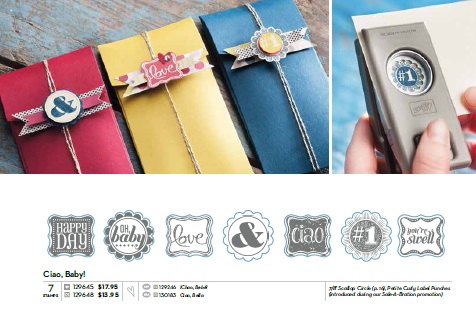 I used the Ciao, Baby stamp set in the Spring catalog (Page 16), along with the Curly Lable Punch and the wonderful little Sale-a-bration Petite Curly Label Punch for the tag.