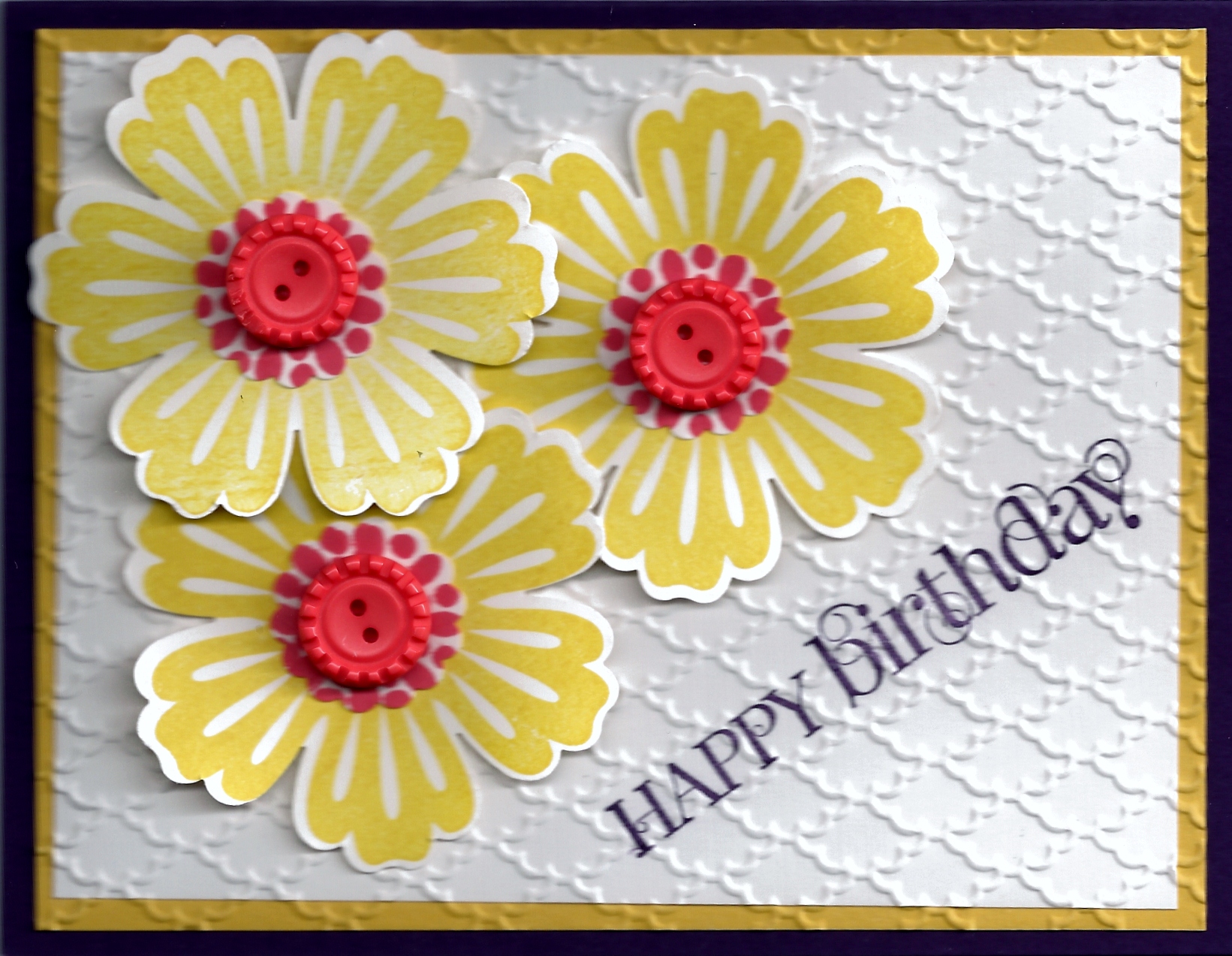 We used Elegant Eggplant, Daffodil Delight and Whisper White card stock. We stamped the “Happy Birthday” in Elegant Eggplant, the flowers in Daffodil Delight, and the flower centers in Calypso Coral. The centers were stamped on a scrap piece of paper and then punched out with our cute 7/8″ Scallop Circle Punch. I attached the buttons from the Sale-a-bration catalog. I ran the Whisper White and Daffodil Delight card stock through the Big Shot using the Fancy Fan Embossing Folder. The flowers were punched out with the Blosssom punch and adhered with Dimensionals. Enjoy!