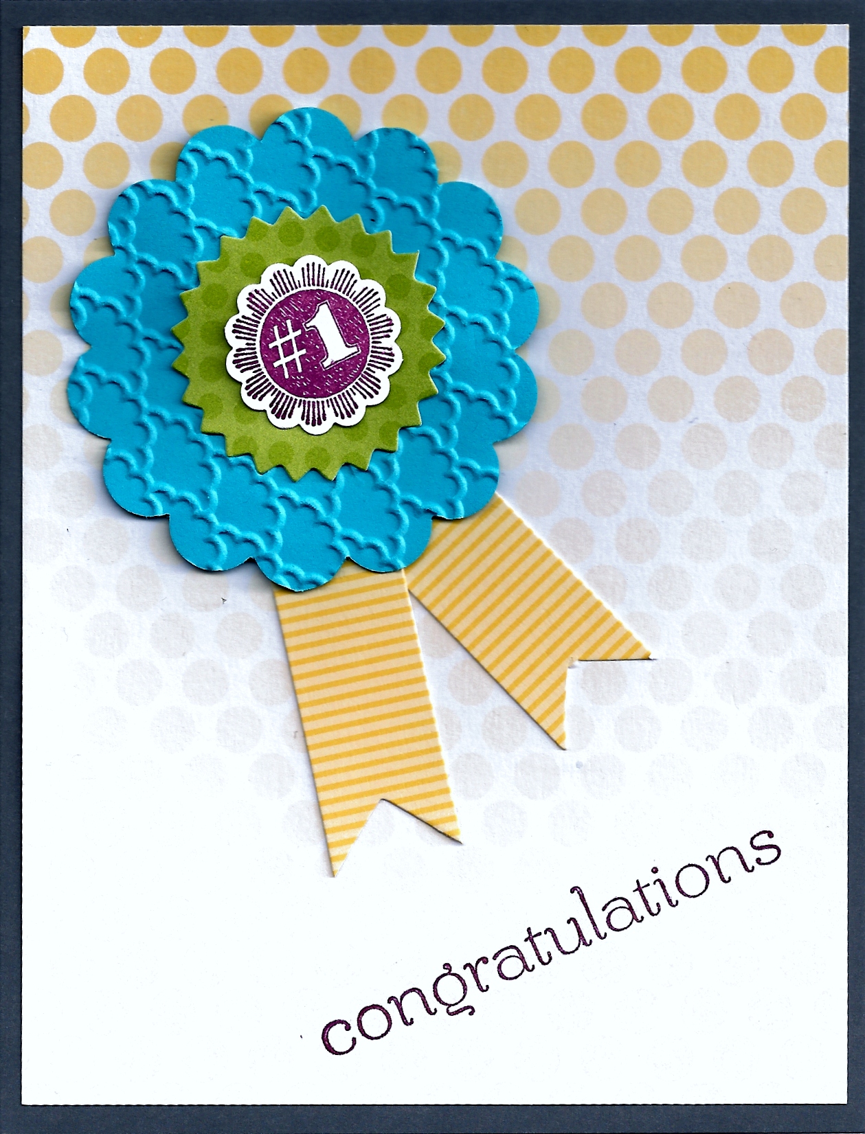Let’s step this up a bit with this next card. I placed the Designer Series Paper on the Basic Gray card base. I took the Daffodil Delight sticker and cut it in half. I then notched the one piece to match the pre-cut one and placed them on the card to make my ribbon. I then took the 2-3/8″ Scallop Circle Punch and punched some Tempting Turquoise card stock. I ran this punched piece through the Fancy Fan Embossing Folder using the Big Shot. I layered my scallop sticker on the punched piece. I then took my Ciao, Baby stamp set and stamped the #1 in Rich Razzleberry on Whisper White card stock and punched it out using the new 7/8″ Scallop Circle Punch. I placed this on my other piece using a Dimensional, and the entire piece was added to the card as shown using Dimensionals. I stamped “congratulations” from the Sweet Elements stamp set in Rich Razzleberry.