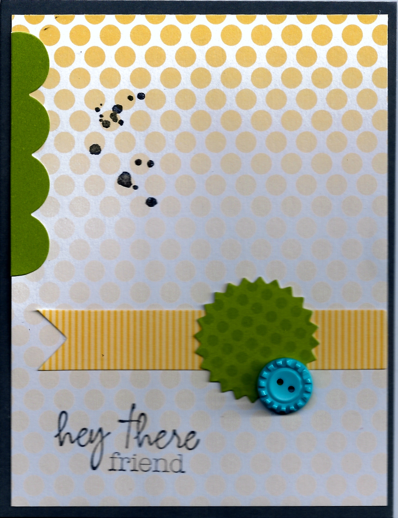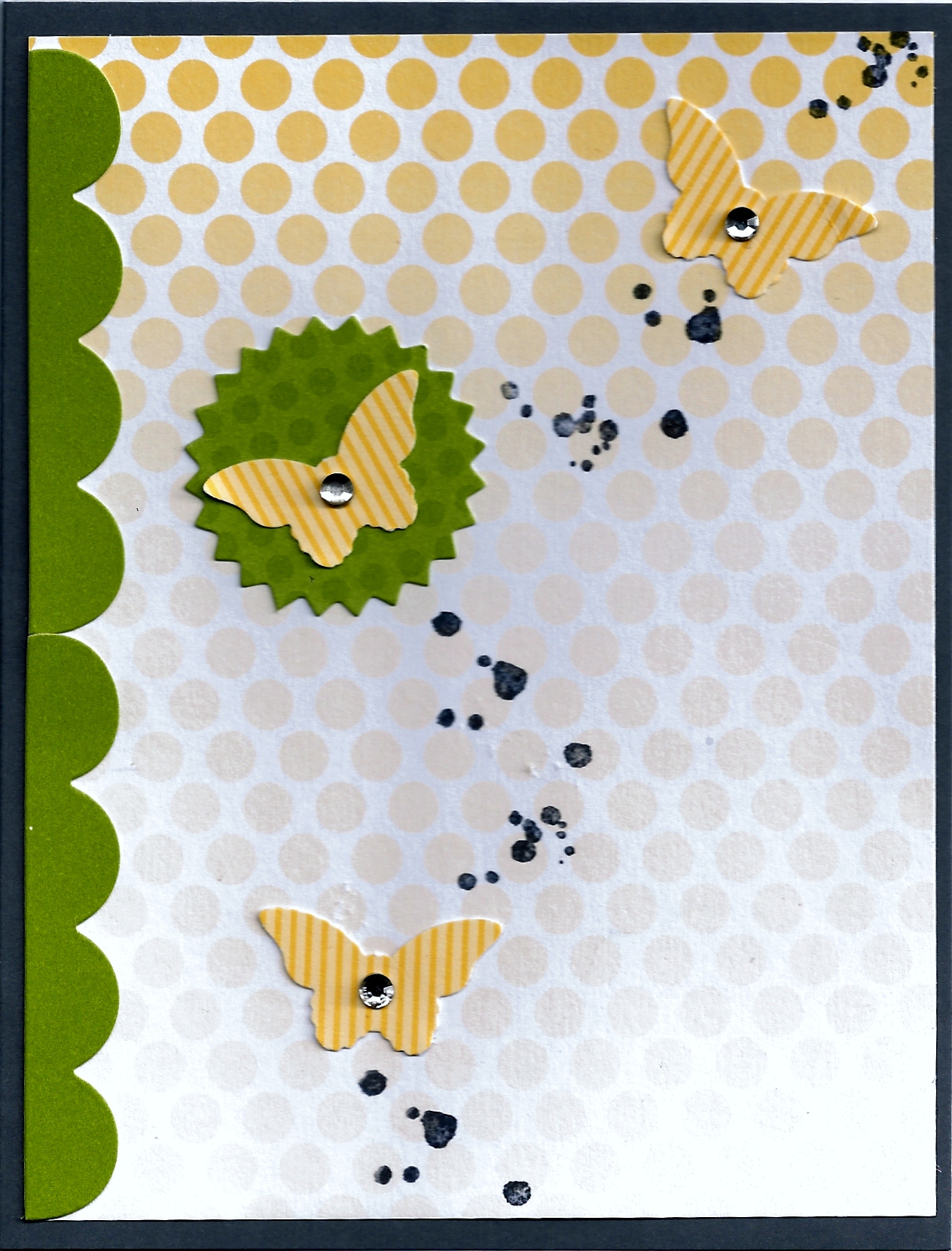 My final card used the two leftover scallop borders from the set, placing them along one side of the Designer Series Paper. I stamped randomly across my paper using the blotchy stamp from the kit, having inked it with the Basic Gray Stampin’ Spot. I next took the Bitty Butterfly Punch and punched my butterflies from the final Daffodil Delight sticker strip. I popped them on my card, along with the final scallop circle sticker. Of course, I just had to add a little bling – Rhinestone Jewels on the butterflies.