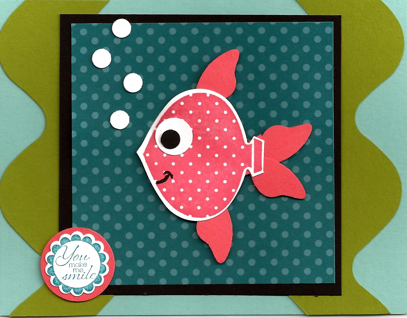- The Island Indigo In Colors Designer Series Paper was added to Basic Black card stock and adhered to my card. The fish was added using Dimensionals and the bubbles added using Mini Glue Dots.