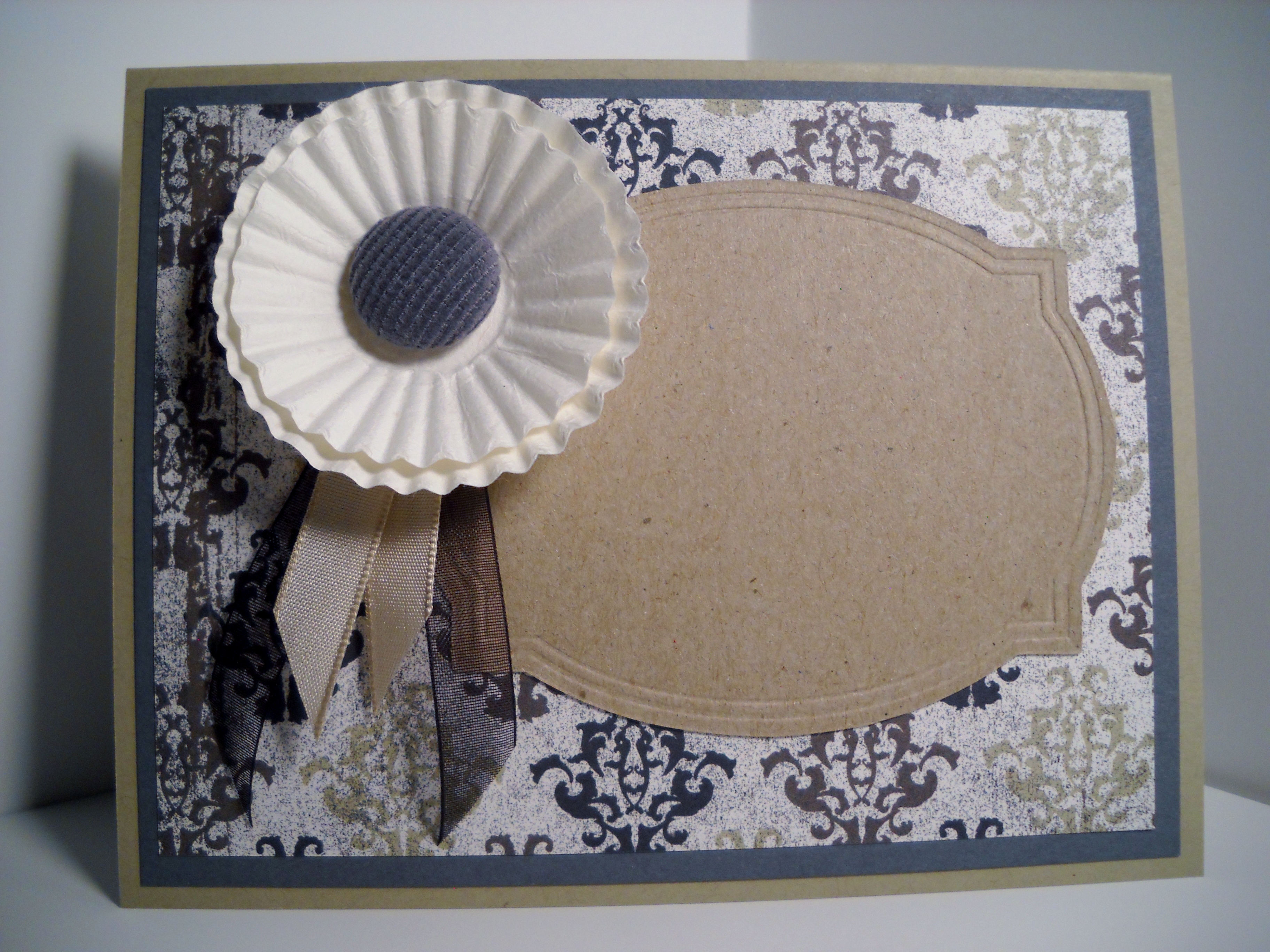 I layered Basic Gray card stock on a Crumb Cake card base and then adhered my Designer Series Paper to that. I attached the label from the Pop-Up Posies Kit next. I also took a couple of the cupcake-like liners from the same kit, flattened and stretched them a bit, and inserted my brad through the middle. Out came some black and kraft retired ribbon from years gone by, and then everything was adhered to my card. I have left the label blank and will probably emboss my sentiment with Black Embossing Powder when the time comes to use this card.