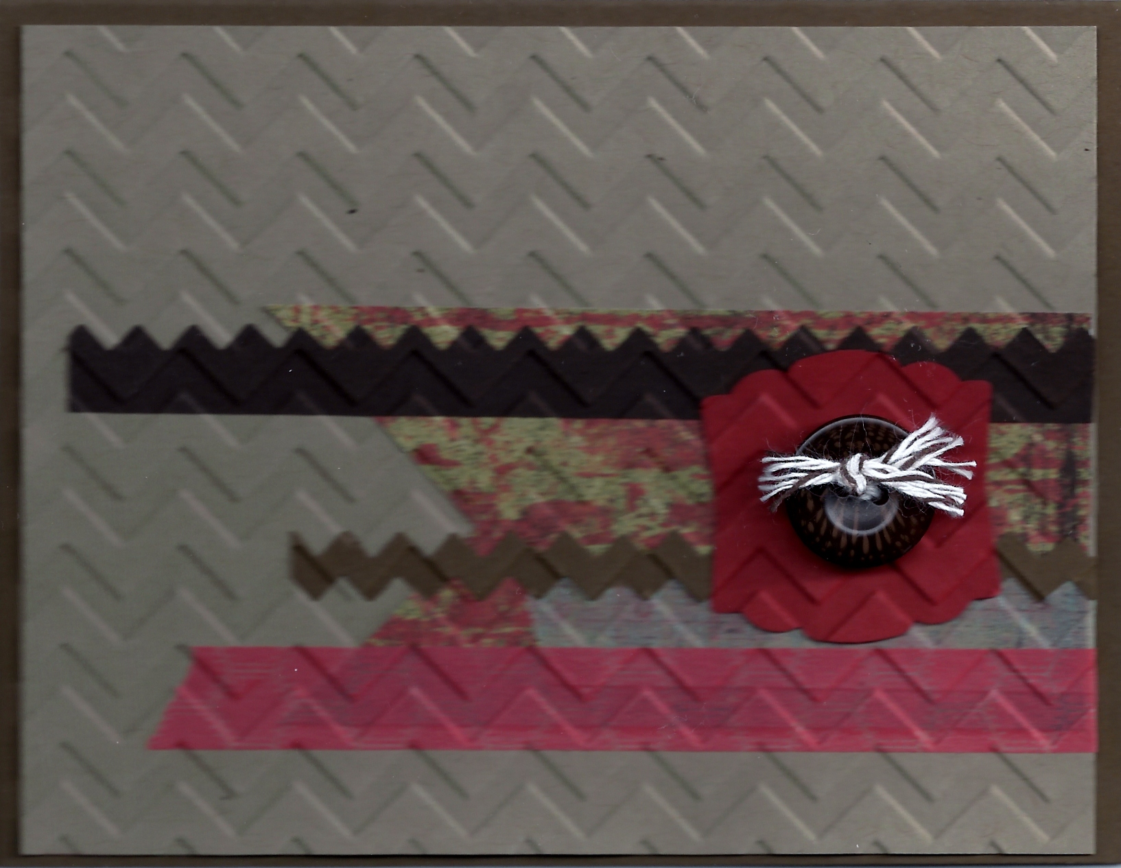My colors are off a little bit on my scan, but I started with a Soft Suede card base. I then took Crumb Cake card stock, some retired Well Worn Designer Series Paper, Early Espresso card stock, my Washi Tape, and just started layering. I used the Tasteful Trim die for the zigzag strips. Finally I added the Artisan Label Punch, punching from Cajun Craze card stock, and ran the whole piece through my Chevron Embossing Folder before attaching it to my card base. I popped on a retired Neutral button with the Early Espresso Baker’s Twine threaded through it. Fun, quick and simple.