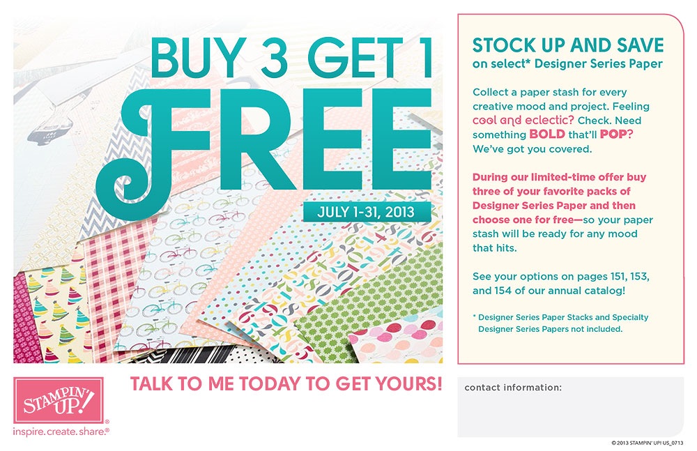 Another great special from Stampin’ Up! in July. From July 1st through July 31st, buy three packs of selected Designer Series Paper and get one FREE! You can choose from the following: