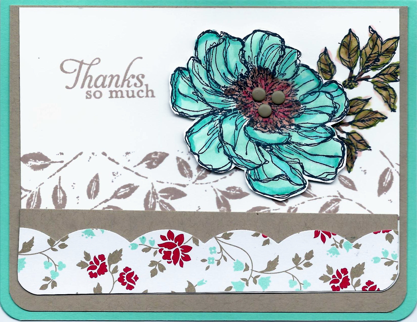 First off, I stamped my flower using the Memento pad and then used the medium and light Coastal Cabana Blendabilities to color my flower. I cut it out. I layered the Coastal Cabana card with Crumb Cake cardstock. I’m afraid my scan has it a little grayer than what it truly is. The Designer Series Paper was from a retired paper stack, trimmed with the Large Scallop Edgelit.