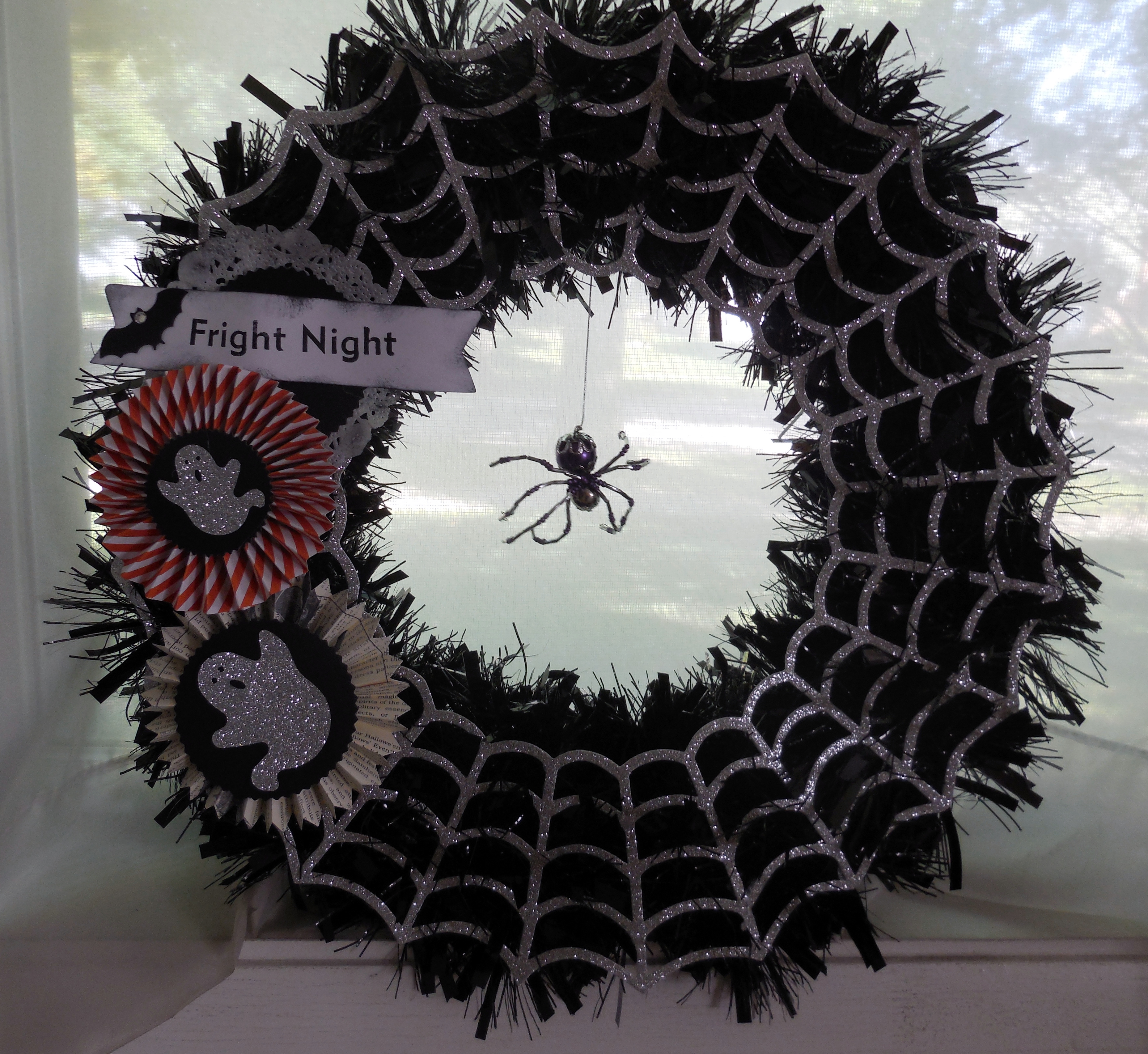 The way the wreath is originally designed, you don’t see the spider very well. After all the work to make this spider, I wanted people to be able to see him! It really wasn’t hard, but I have to admit that I didn’t know I would have to bead the spider myself. Anyway, I dangled him from the middle of the wreath. Then I cut the rosette in half and created a smaller orange rosette and added my own additional rosette made from the Witches Brew Designer Series Paper. The ghosts are from an old Sizzix die and cut from Silver Glimmer Paper. I really like how it turned out. Don’t be afraid to play with your wreath and see what you come up with!