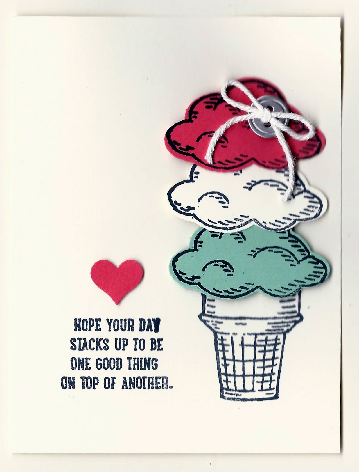 Of course, Pinterest came to the rescue when designing this card. Thank you to the wonderful person who created the original. I made a few minor adjustments to work with my stamping supplies. We started with a Very Vanilla card base and layered another piece of Very Vanilla on top. I stamped the cone, ice cream scoops and the saying using Memento Tuxedo Black ink. Of course, we needed vanilla (Very Vanilla), strawberry (Watermelon Wonder), and mint (Mint Macaron) ice cream scoops. Keep Thinkin’ Inkin’!