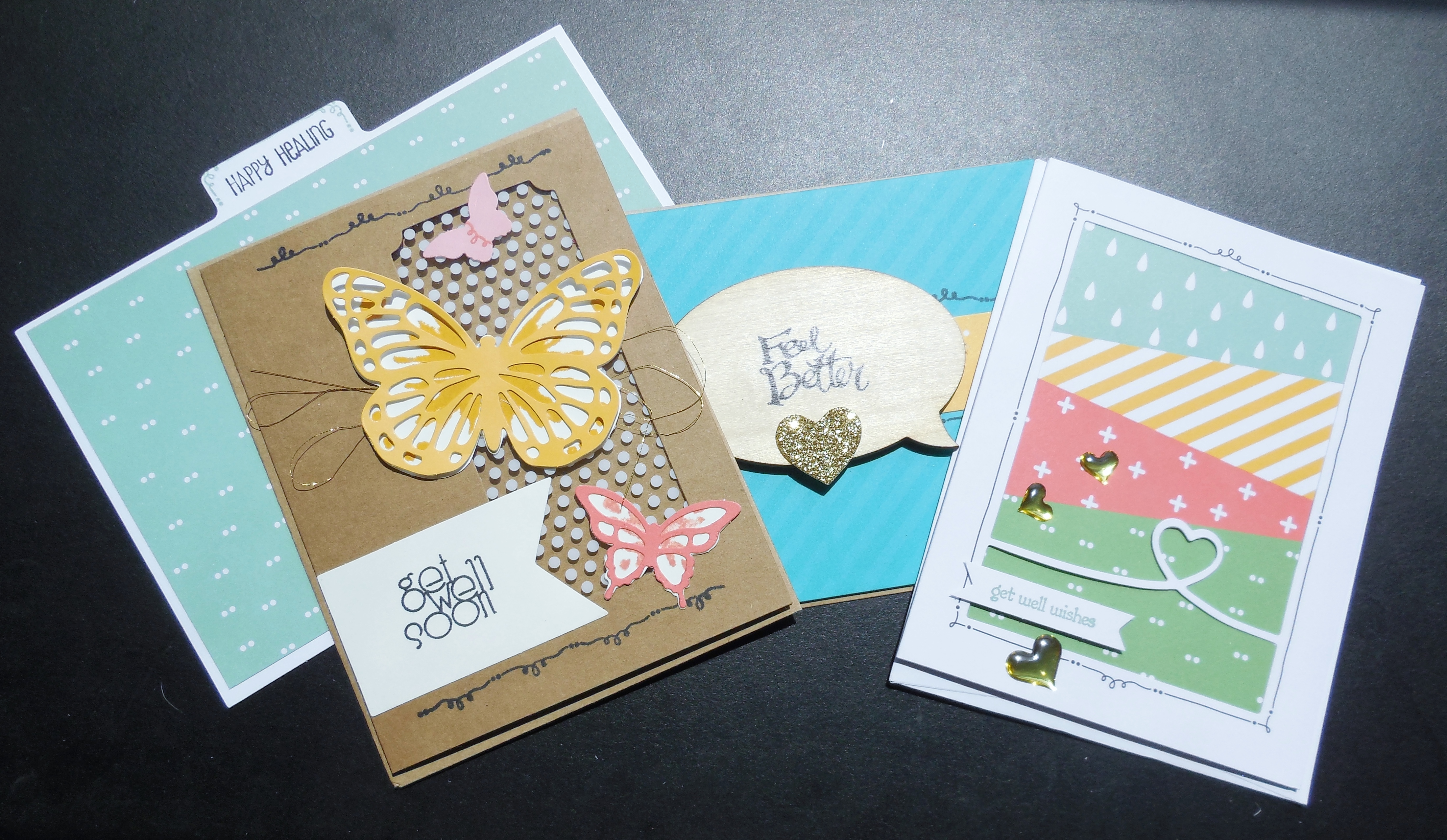 This is the whole kit and kaboodle! The Tin of Cards stamp set didn’t really have a stamp for a Get Well tab; so, I improvised with the Happy Healing from another set.
