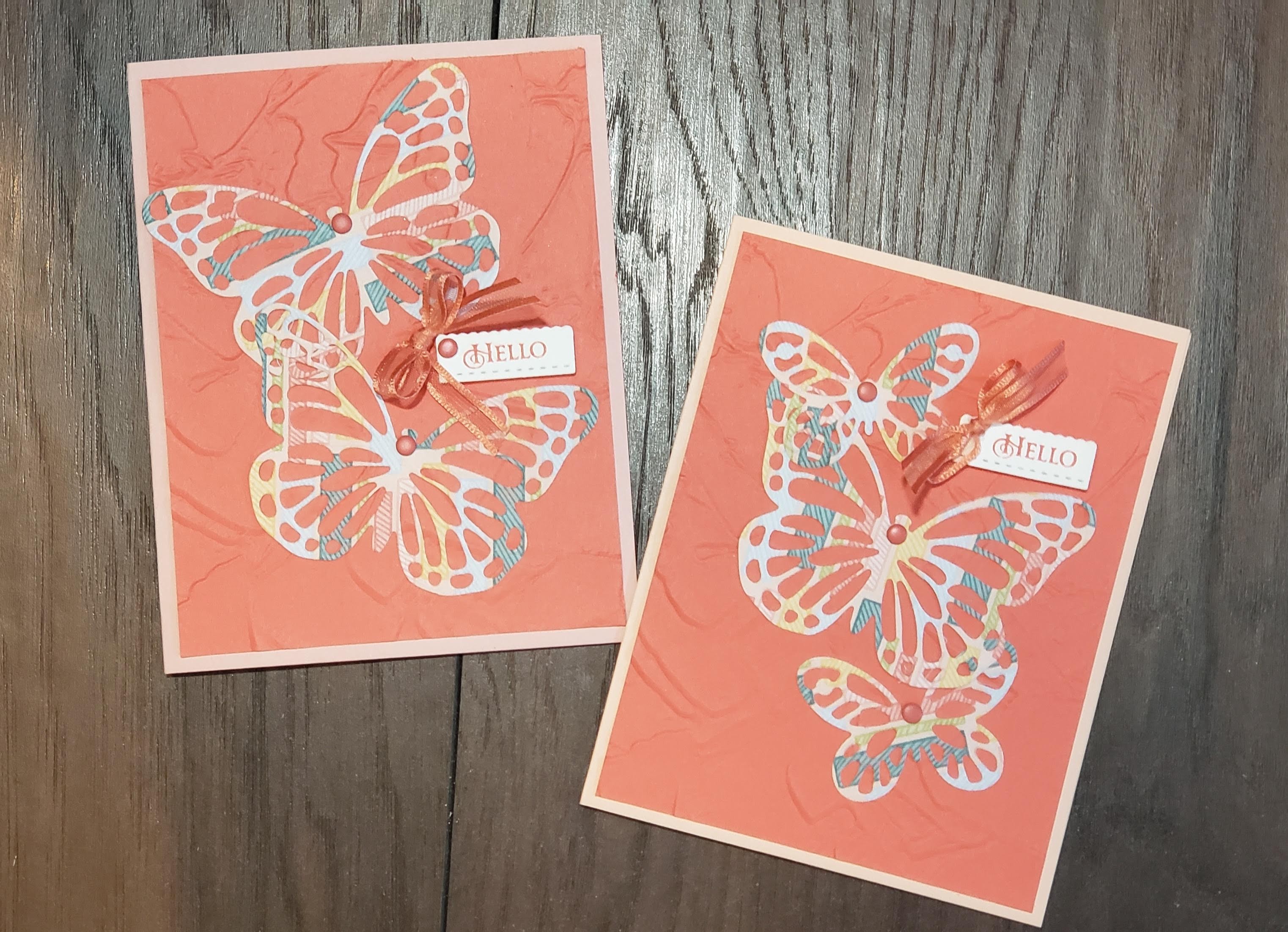 For this card, I wasn’t that impressed with the block design on the other envelope liner and decided to use two other retired dies, Bold Butterflies and Butterflies, to cut the paper. I knew once I cut out the butterflies, you wouldn’t notice the blocks quite as much. I used Petal Pink cardstock as the base and then adhered Calypso Coral cardstock, after running it through the Painted Textures embossing folder. Once again, the sentiment came from the Honey Bee set and placed on another diecut from the Stitched Labels die. I added the Grapefruit Grove ribbon and a few other dots.