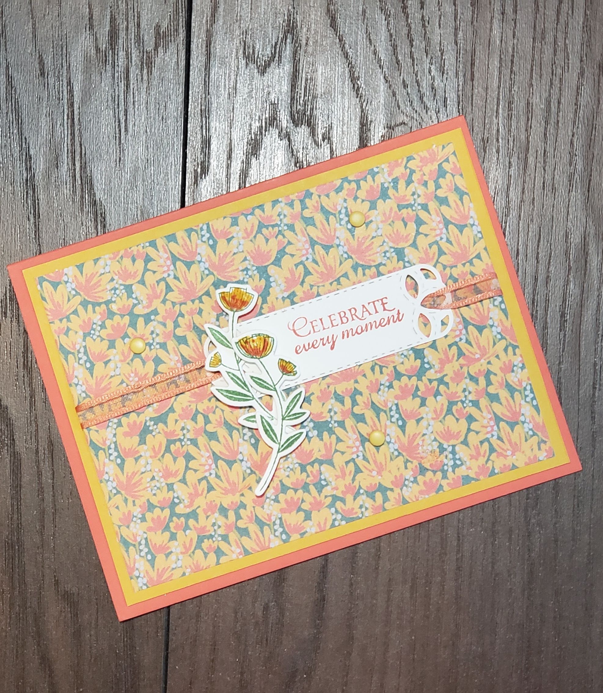 Well, I was cleaning off my desk and noticed the envelope liners from the March Paper Pumpkin and I told you in the last blog post I would do something else with these liners. I knew, since they were right in front of me, there was no better time than the present. I took some Calypso Coral cardstock for the card base and added a layer of Bumblebee.