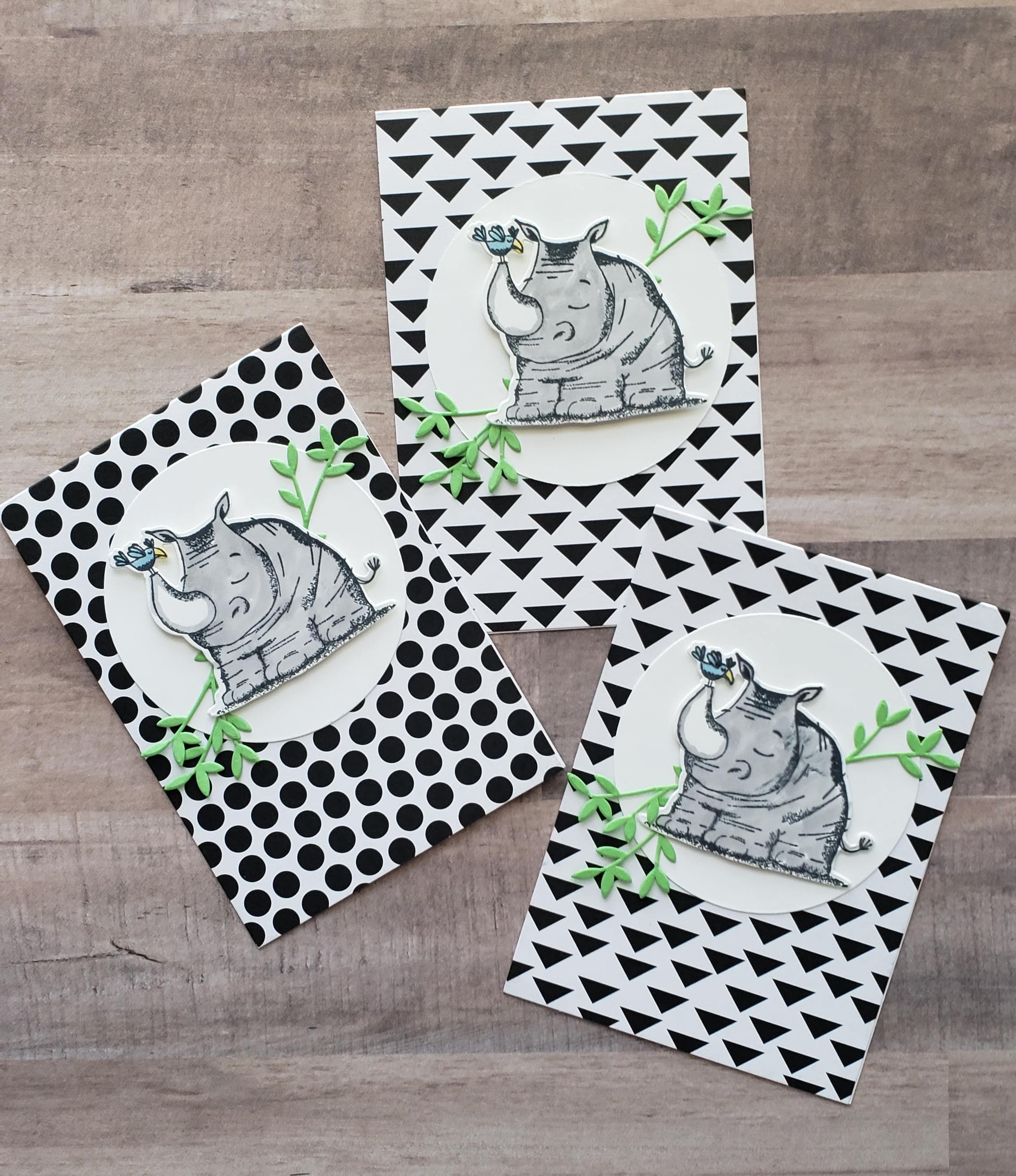 Isn’t this guy a cutie-patootie?!? I was going through my stash of cards and found about eight of these cards. The black and white card base was swiped from an old Paper Pumpkin kit. This kit originally had you stitching “Thanks” in yellow yarn and placed on the card. That definitely wasn’t my style, so I took the card base, added a circle and the rhino. There is a coordinating die with this retired Animal Outing stamp set. I colored in the rhino using my Stampin’ Up! Blends. Even though I don’t have any more of these card bases, I have plenty of black and white Designer Series Paper, and I believe I’ll be making a few more of these to keep in my stash. He’s just too fun to keep hidden away! Keep stampin’ and scrappin’!
