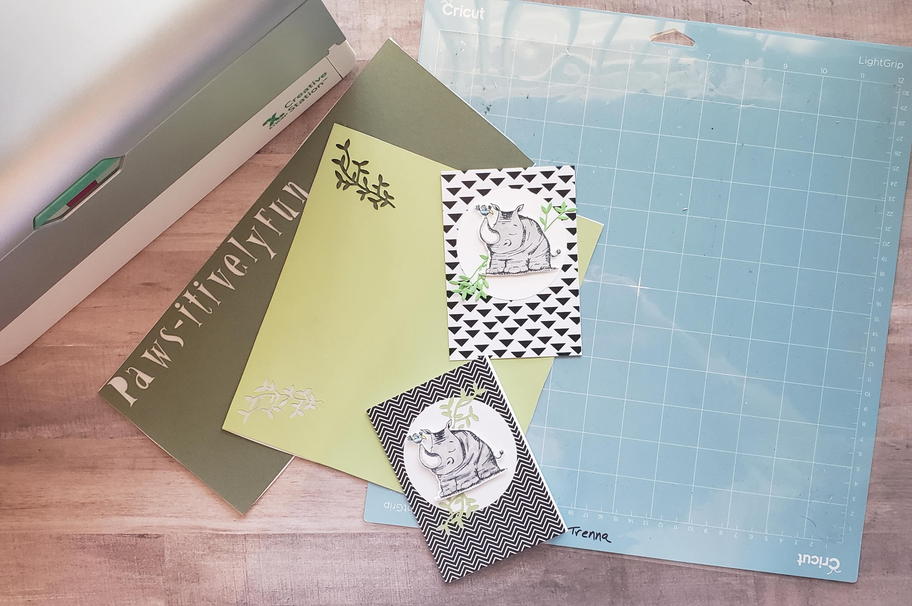 Once everything was cut, I went through my stash and found plenty of black and white paper and adhered it to the front of the Note Cards & Envelopes I always keep on hand from Stampin’ Up!. These are great card bases measuring 5×3-1/2 with corresponding envelopes, a set of 20 in a pack. I, of course, had fun using my Blends to color in my rhino and ran the colored images through my Big Shot using the corresponding die and attaching him with Dimensionsals.