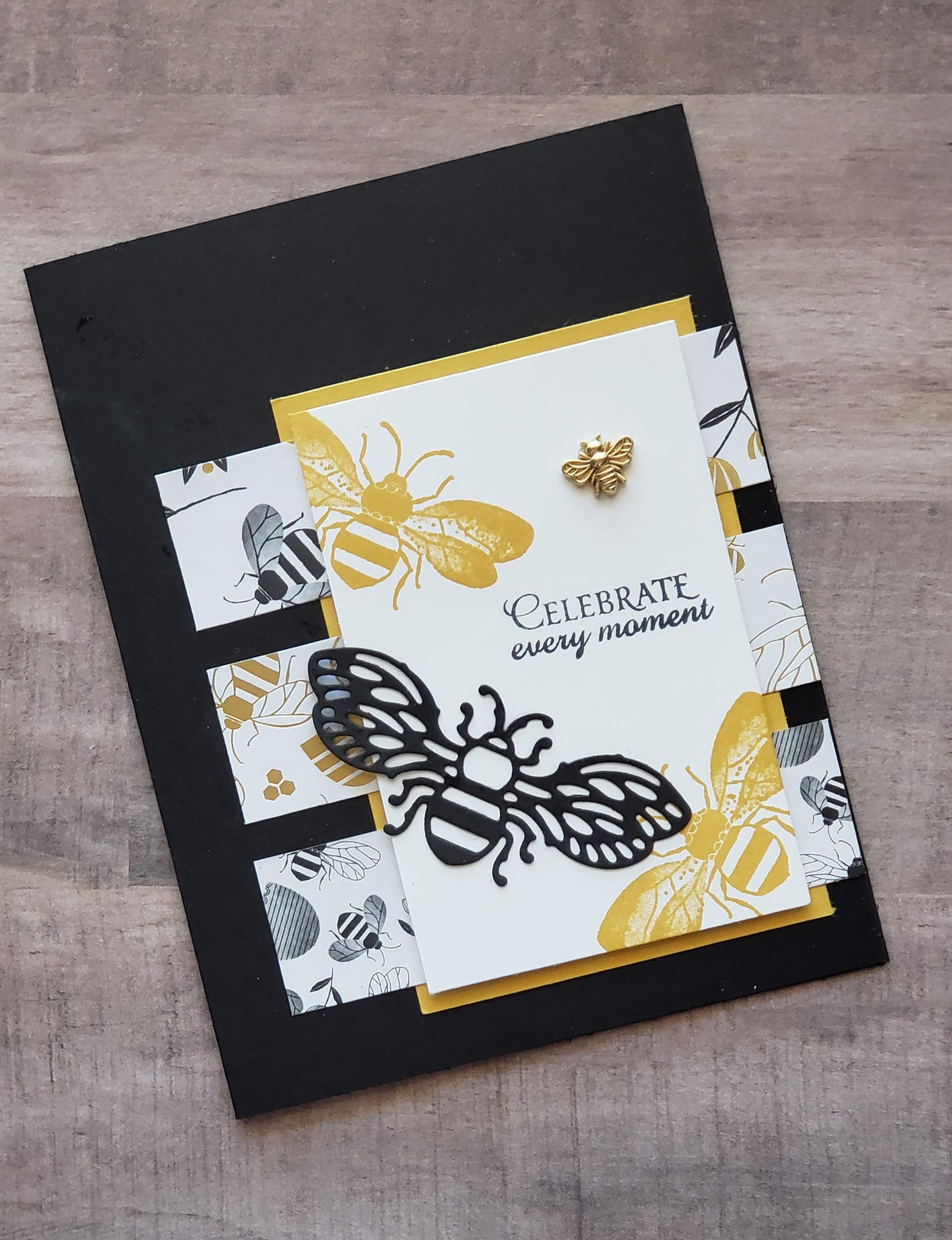 For the above card, I used all of the same dimensions but moved the strips to the right side of the card and down a little bit. This time I stamped the bees in Bumblebee ink and cut the large die-cut bumblebee from Basic Black cardstock. My little Bumblebee Trinket got added to the Whisper White cardstock above the sentiment this time.