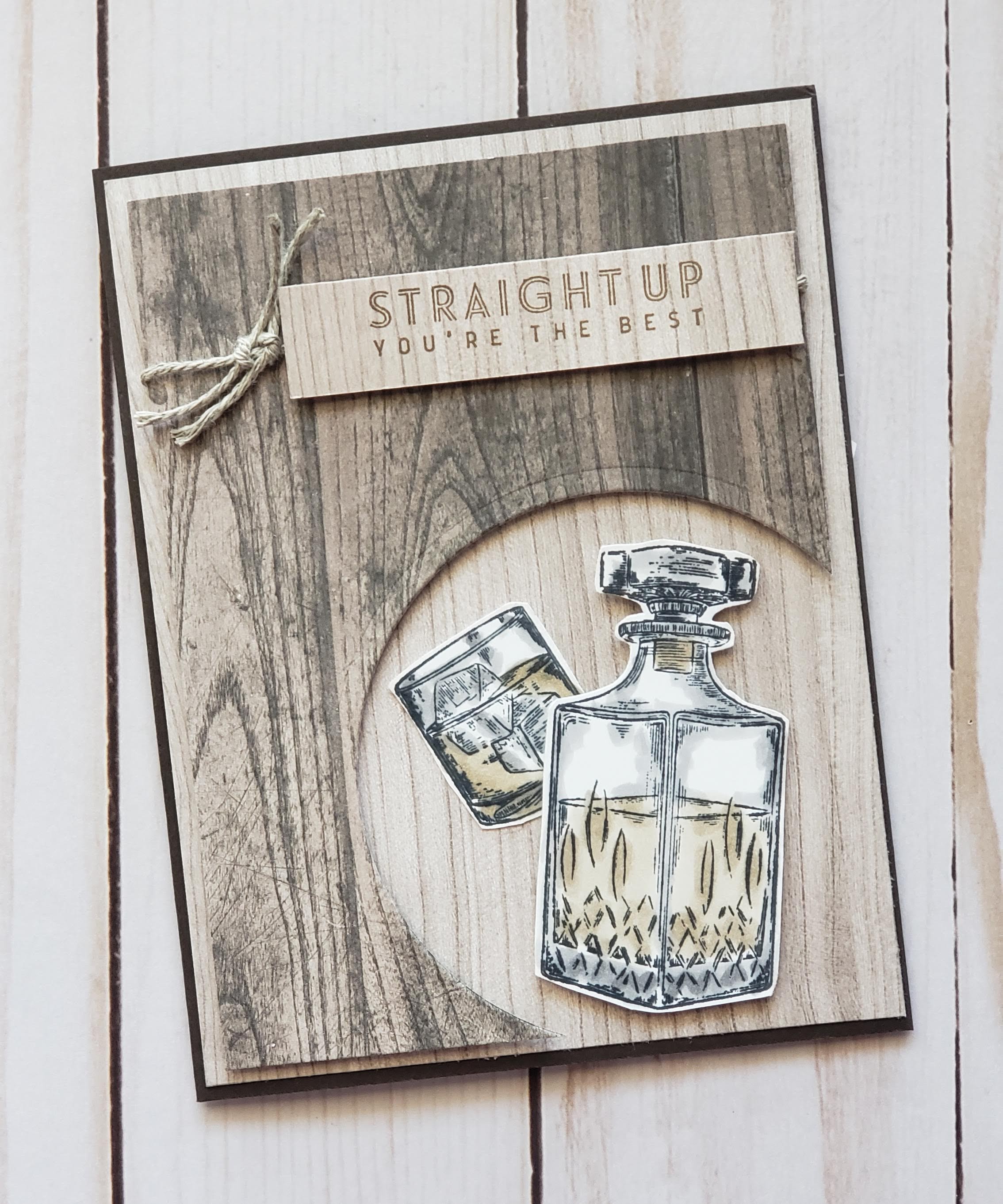 Once again, I stamped the images in Memento Tuxedo Black ink and played with my watercolor pencils. I used my blending pen to smooth everything out and then added Wink of Stella to the whiskey. The photo muted a lot of the colors and you can’t see the glimmer, but you can get the idea. I fussy cut the images and used Dimensionals to adhere them to the card.