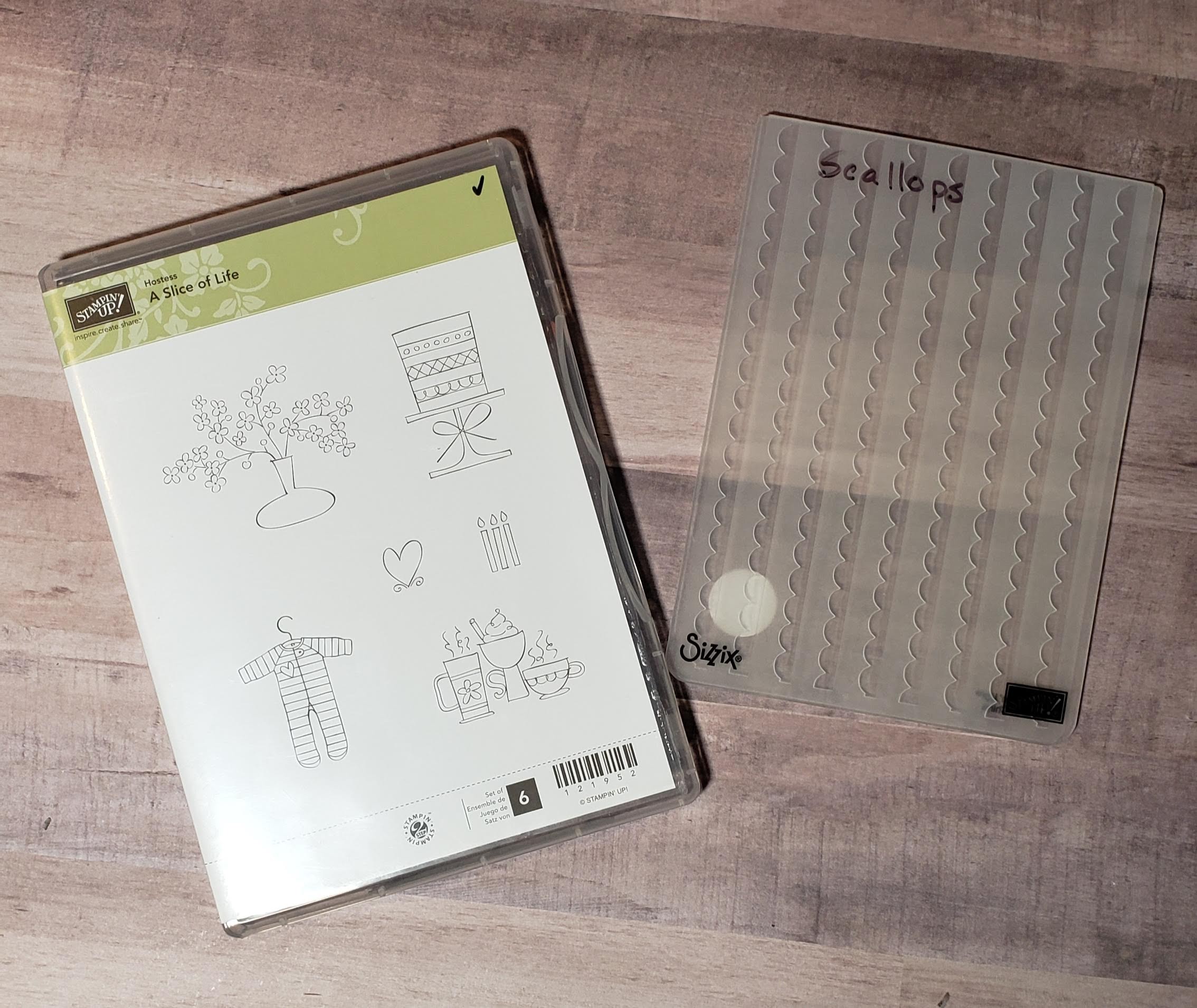 I started with a base of retired Pink Pirouette cardstock (trying to use up a lot of my retired stock). I used my 2-1/2″ circle punch and glued the circle on the Basic White cardstock which I had cut at 4 x 5-1/4. I then ran the piece through the retired Scallops Embossing Folder, leaving a bit of the bottom un-embossed. Sorry my photo doesn’t show the embossing very well. That’s what I get for taking photos late at night. I finished it off using the very old retired Sizzix Tasteful Trim and a cute little punched heart. I glued the whole piece to the card base. I like to use our liquid glue on anything that is embossed because I think it simply holds better.