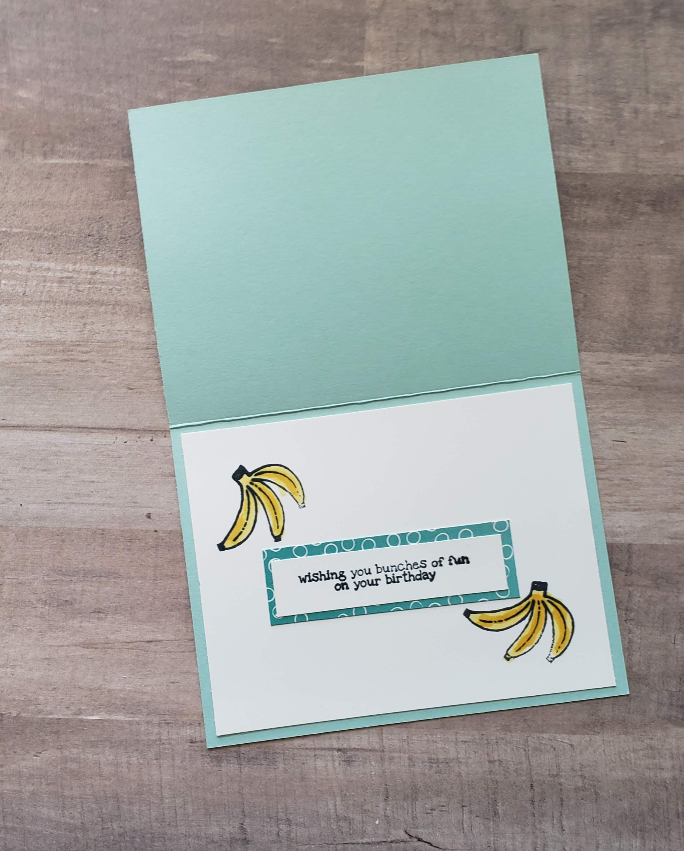 The next card used a similar format, instead using the Layering Squares die and stamping both the girl and the bananas on the square, and still fussy cutting one of the bananas. I did flag the sentiment just to add a little something different to the card.