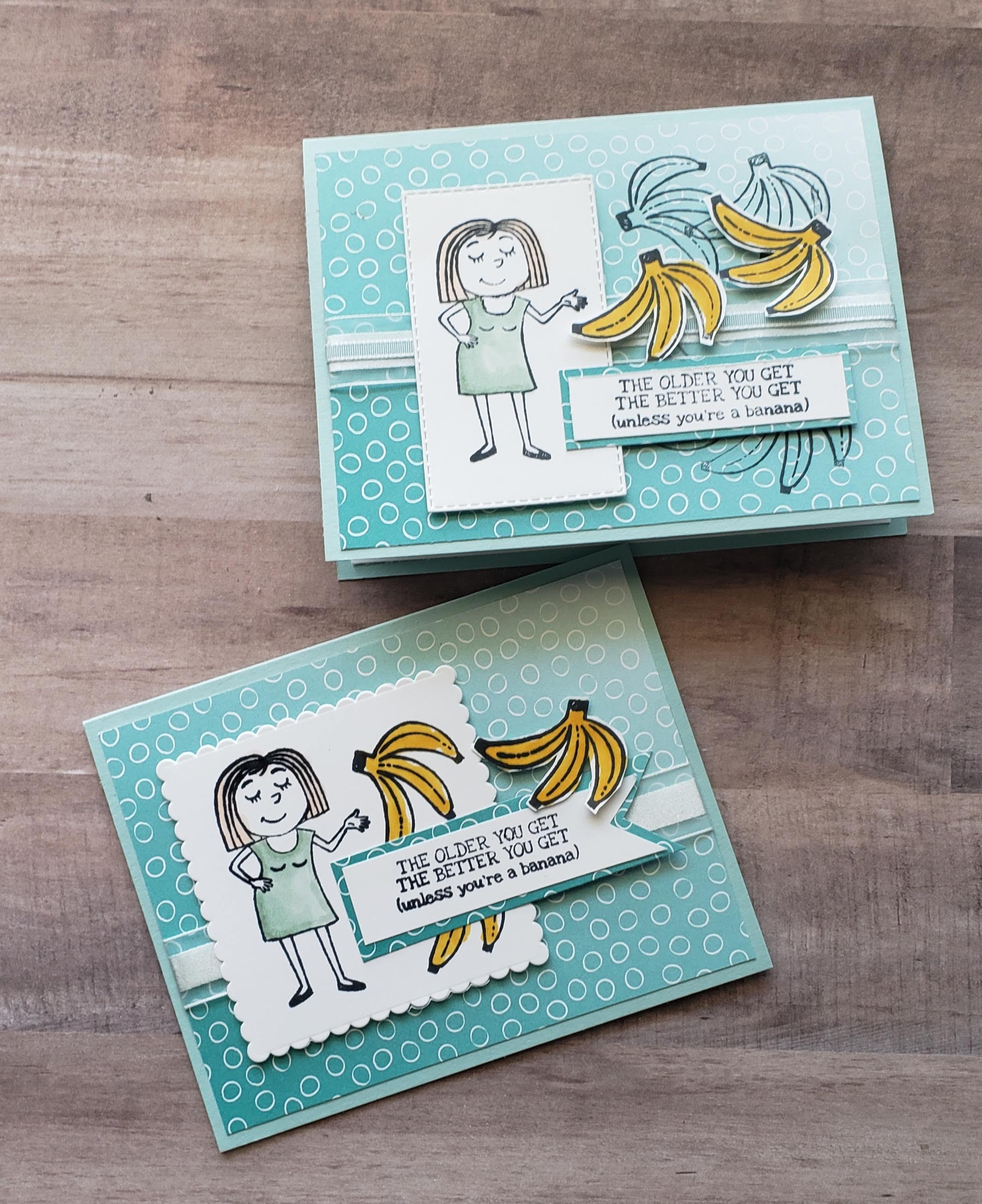 On the top card, I used the Stitched Rectangles die and stamped the girl image on it, using my Blends to color her in. I stamped a few bananas on the Designer Series Paper and then simply wrapped some retired white ribbon around it. The sentiment was stamped and then placed on more of the Oh So Ombre paper, along with fussy cutting a couple more bananas and using my Blends once again.