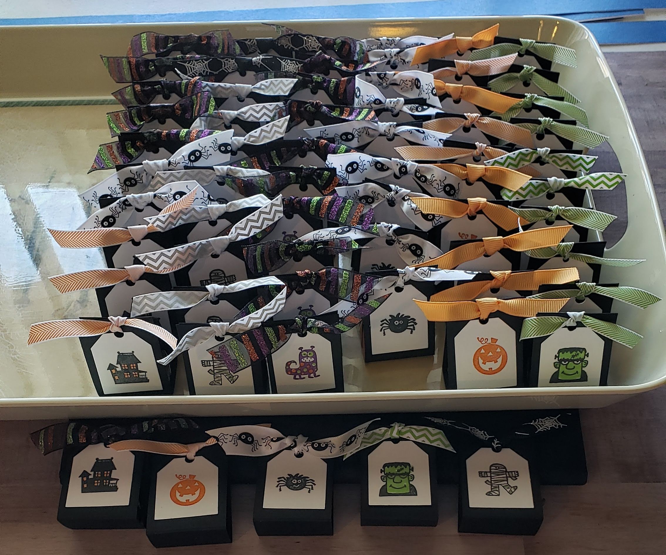 I know I’ve been absent from here but time flies when you’re having fun. I had so many projects going at the same time, I didn’t take the time to update y’all. One of the things I did was make these cute little Halloween gifts for all of the gals at my Bible study, the manicure ladies and hairstylists and even a few friends. Of course, when inserting the candy into these little goodies, I’m afraid it was “one for you and one for me”. The big bag of Hershey’s made 80 of these, not including the few that made it into extra pounds on my hips. I pulled out the old Spooky Bingo Bits for the images and they were done in no time. It actually took longer to tie the ribbon than anything.