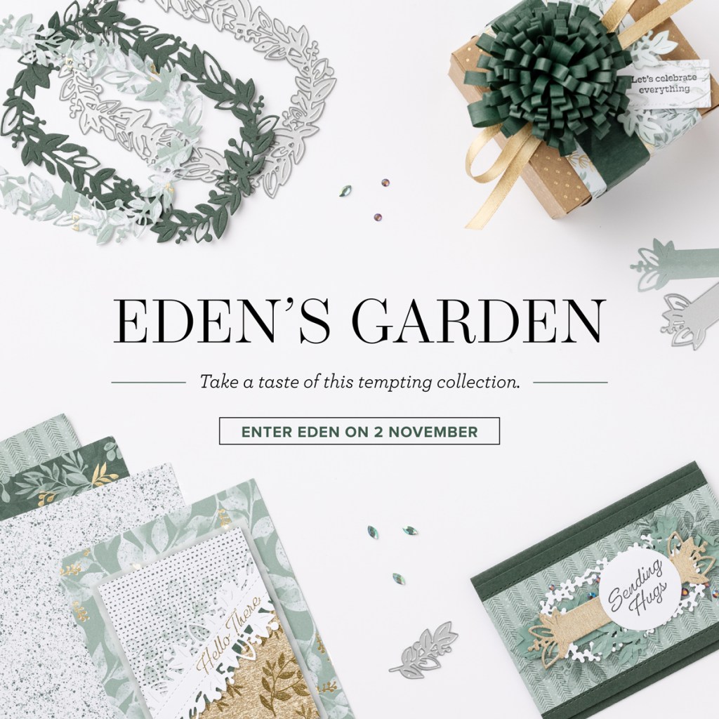 Let’s start with the stamp set Eden’s Garden which is available as an early release item from the Mini catalog coming in January 2022. I’ve attached a copy of the flyer with all of the details on the stamp set and coordinating dies and you can see some of the projects you can create with this stamp set.