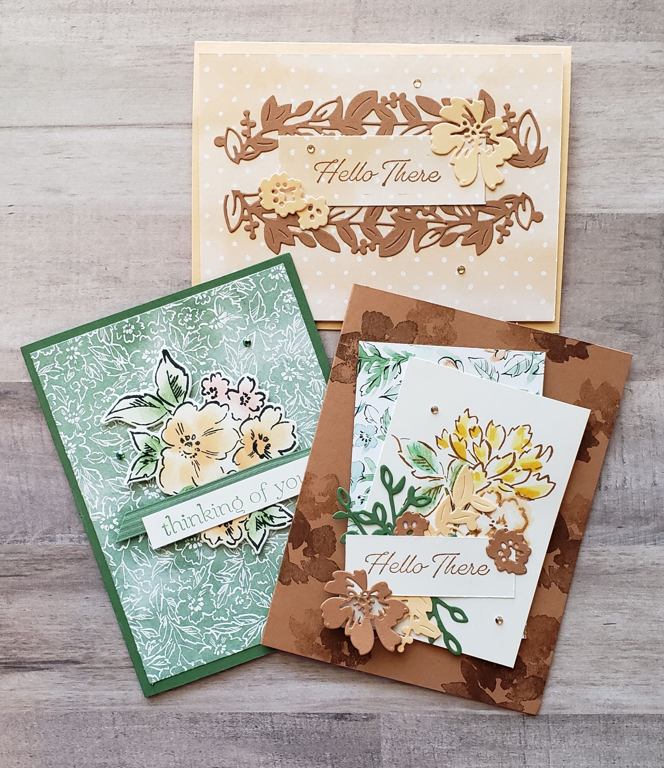 And, finally, the last card used a bit of stamping images on the Cinnamon Cider card base in Cinnamon Cider, adding some DSP and coloring in the flowers using Shimmery White cardstock and my watercolor pencils and a blending pen. I added a few more flowers and stems die cuts from Eden’s Garden, Hand-Penned and the retired Petal Palette stamp sets. Of course, all of the cards needed a little bit of bling added to them!