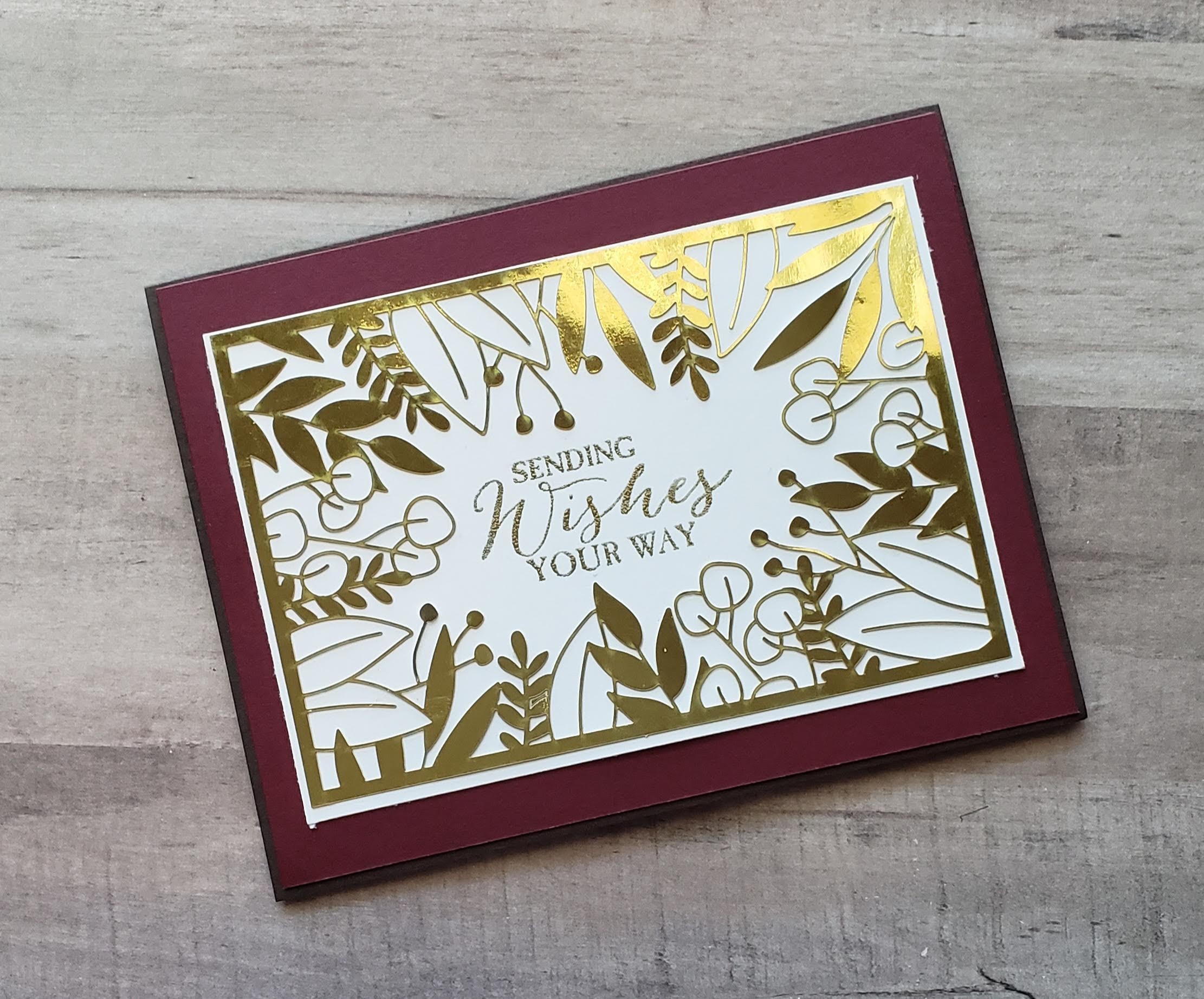 This one is a card base in Basic Black, adding an extra layer on top of Merry Merlot, then a piece of Basic White to make the foil stand out, and embossing the sentiment with gold embossing powder.