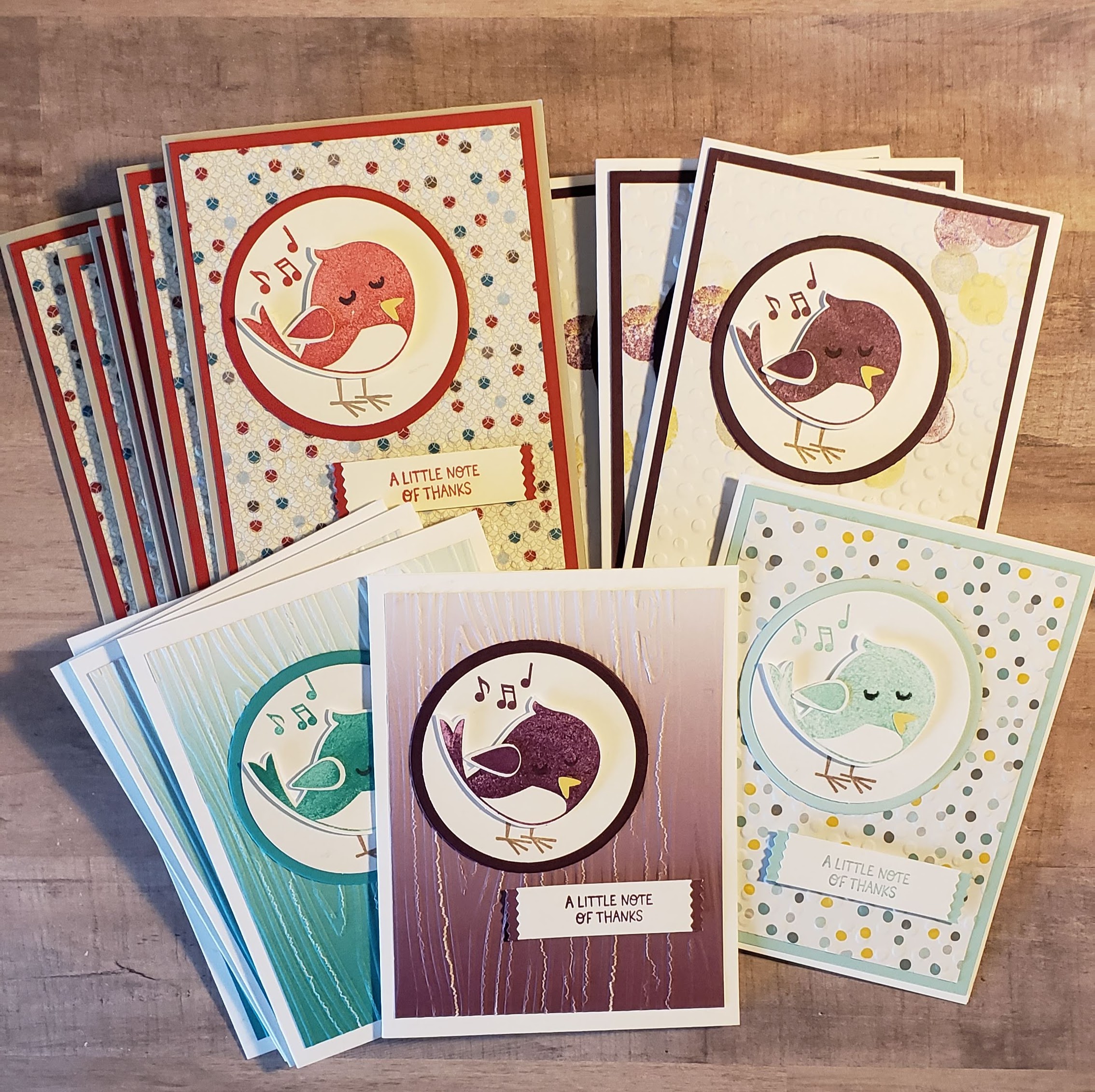 Not too much for me to explain on how I made these cards. I punched out a circle from white cardstock and stamped the bird’s feet on the circle. I then stamped the bird on scrap paper and punched him out using the Songbird Builder Punch and attached him to the circle using Dimensionals. I added the little stamped notes on the same circle, layered the whole thing on a coordinating paper circle, and attached it to the embossed paper. I used my retired Decorative Dots or Woodgrain Embossing Folder for the embossing.