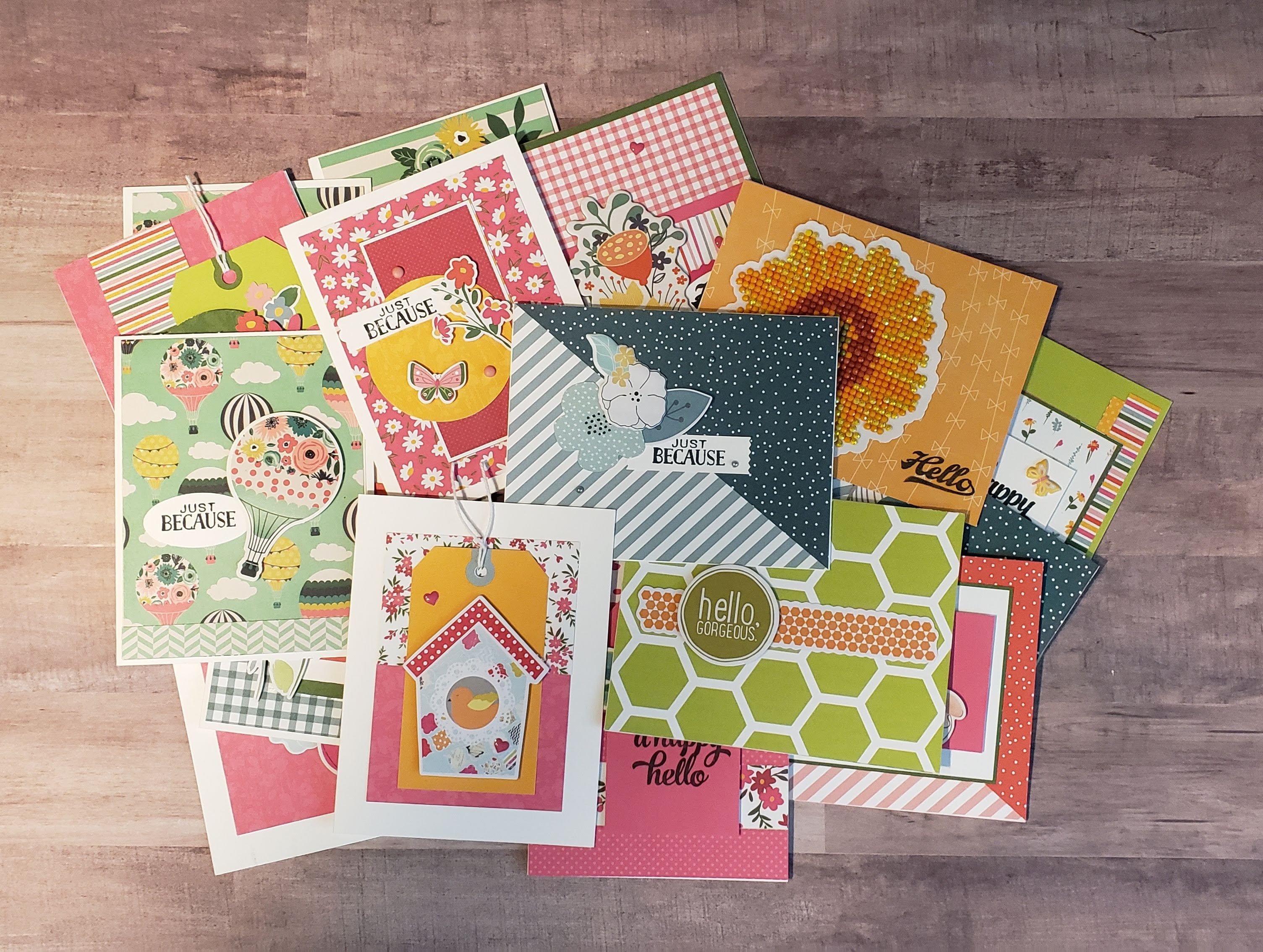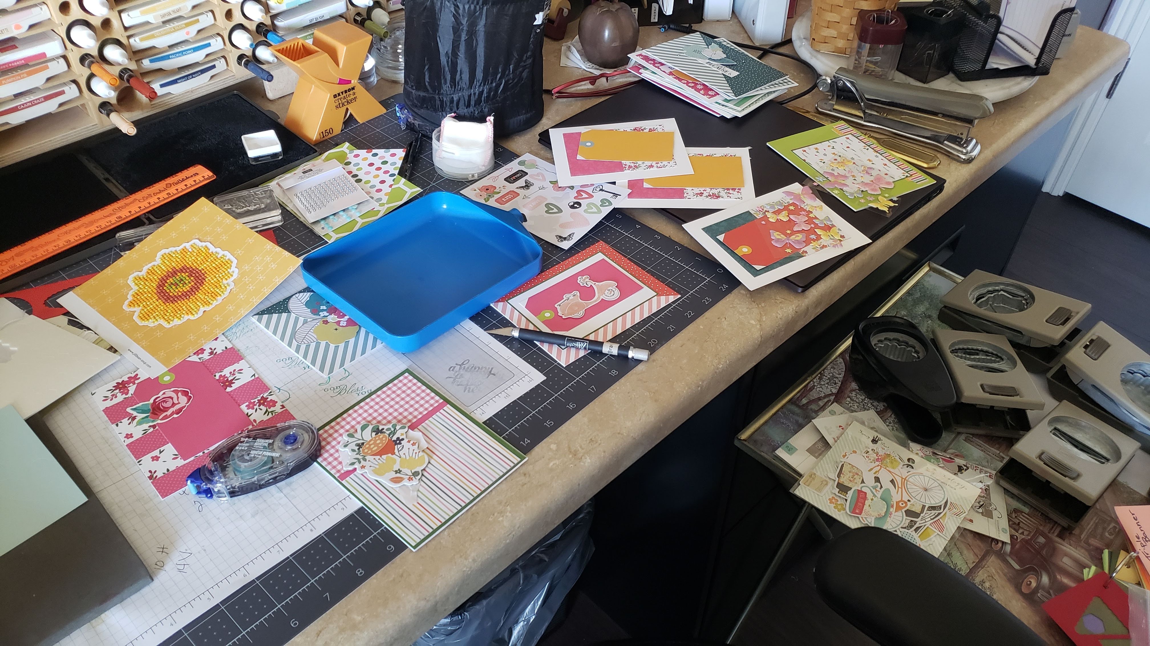 This is the mess that was my craft room this weekend. I have several card-making kits from different companies and conventions I have attended over the years, and it was time to get started on several of those. I put together one kit and had quite a bit of leftover paper, enough to create at least 17 more cards. So I made card bases out of Heavy Basic White Cardstock and then headed to my Scrap Rack to add embellishments. I also pulled out about six or seven stamp sets to add my sentiment to the front of the cards. This is what I ended up with.