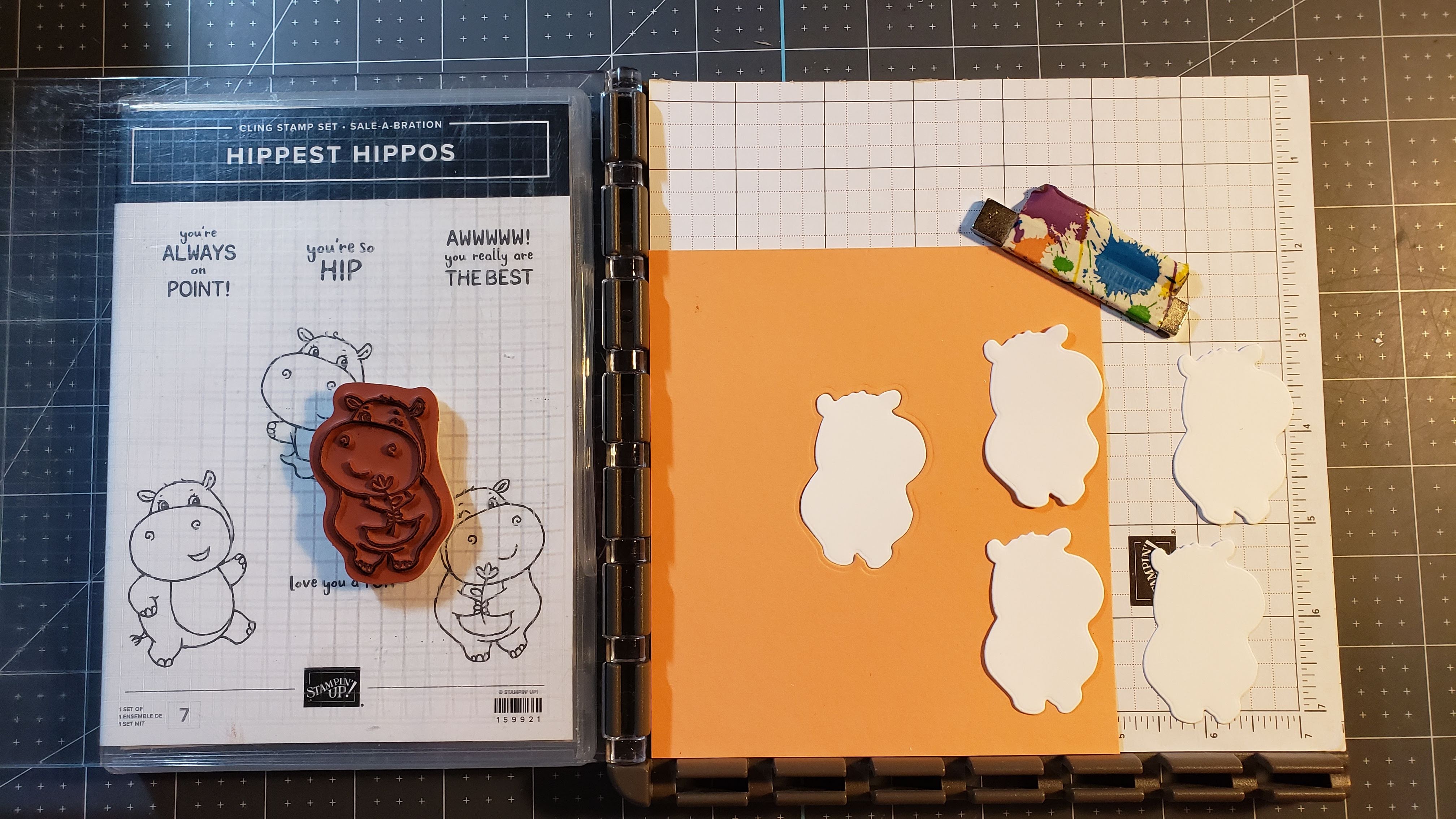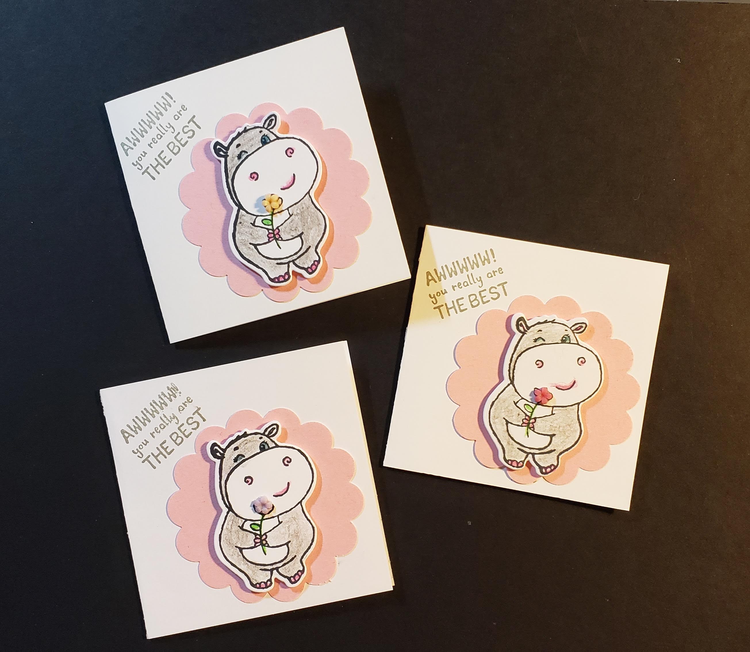 I needed a few more of these cute 3×3 cards to add to my travel bag. I use these to leave a tip for housekeeping when we spend the night at hotels. I probably should have left one at my sis’s-in-law house the last time we visited. She is definitely the “hostess with the mostest”! But, moving on, I wanted to show you my trick when stamping and then using the Stamparatus and framelit to cut out the image. First, though, I cut the base card at 6×3 and scored it in the middle. I used a 2-3/8″ scallop circle punch for the pink scallop, and then colored in my hippo using watercolor pencils. I added a flower from the Loose Flower Flourishes from Stampin’ Up!