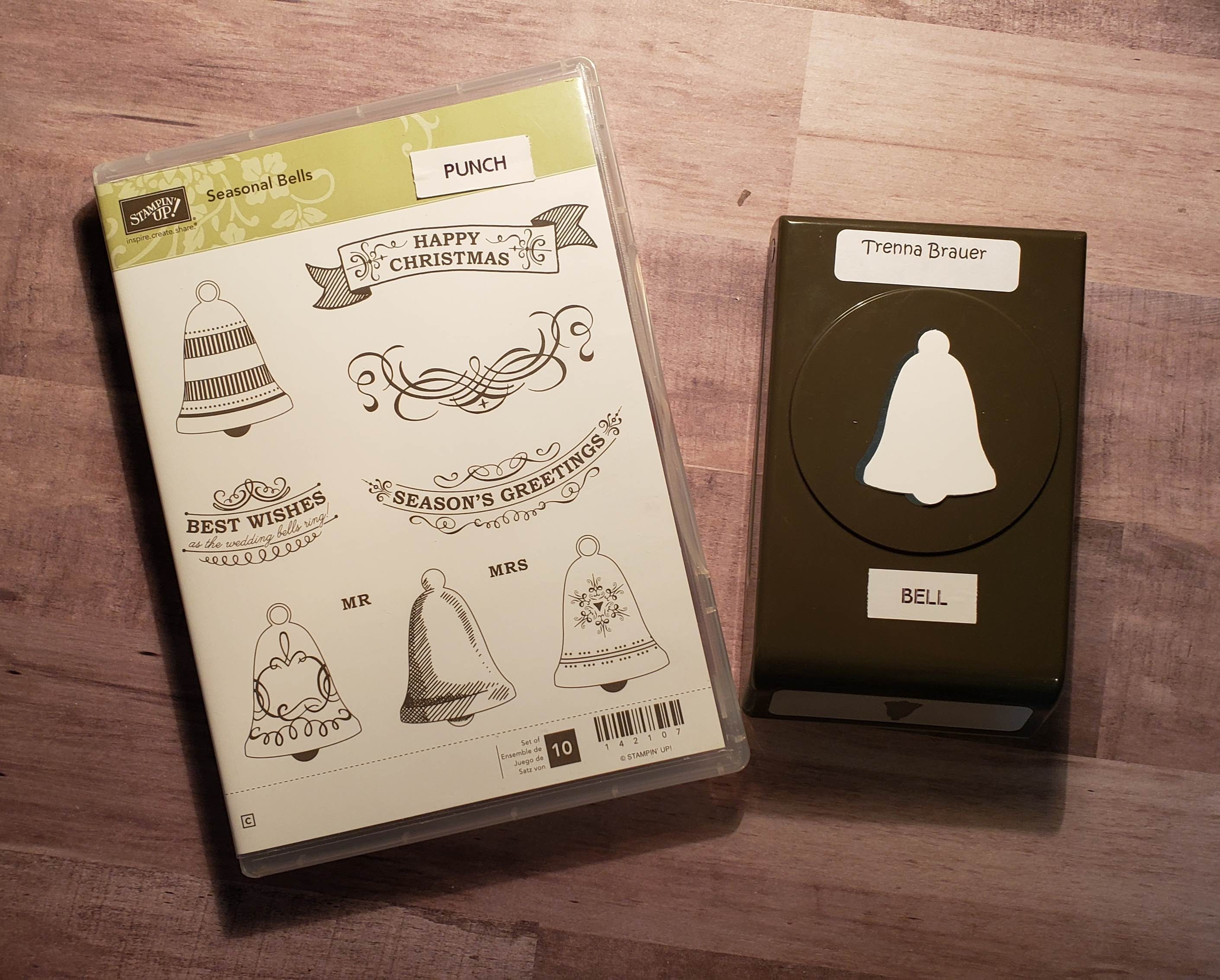 I then went to my retired Seasonal Bells stamp set with the coordinating Bell punch. I stamped my bells in Cherry Cobbler and then added the current Flat Jingle Bell Trinkets to the top of the bells. I punched a hole in the tag and the top of the bells and threaded through some retired ribbon. The tag and the bells were placed on dimensional and then adhered to the card.