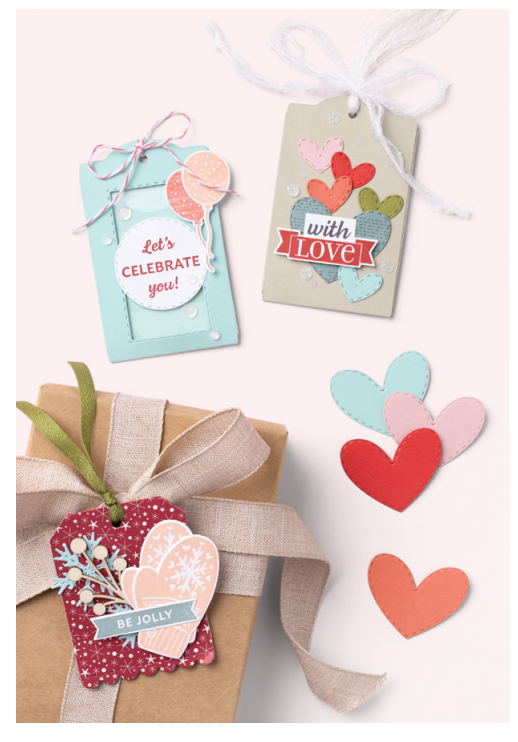 I then went to my retired Seasonal Bells stamp set with the coordinating Bell punch. I stamped my bells in Cherry Cobbler and then added the current Flat Jingle Bell Trinkets to the top of the bells. I punched a hole in the tag and the top of the bells and threaded through some retired ribbon. The tag and the bells were placed on dimensional and then adhered to the card.