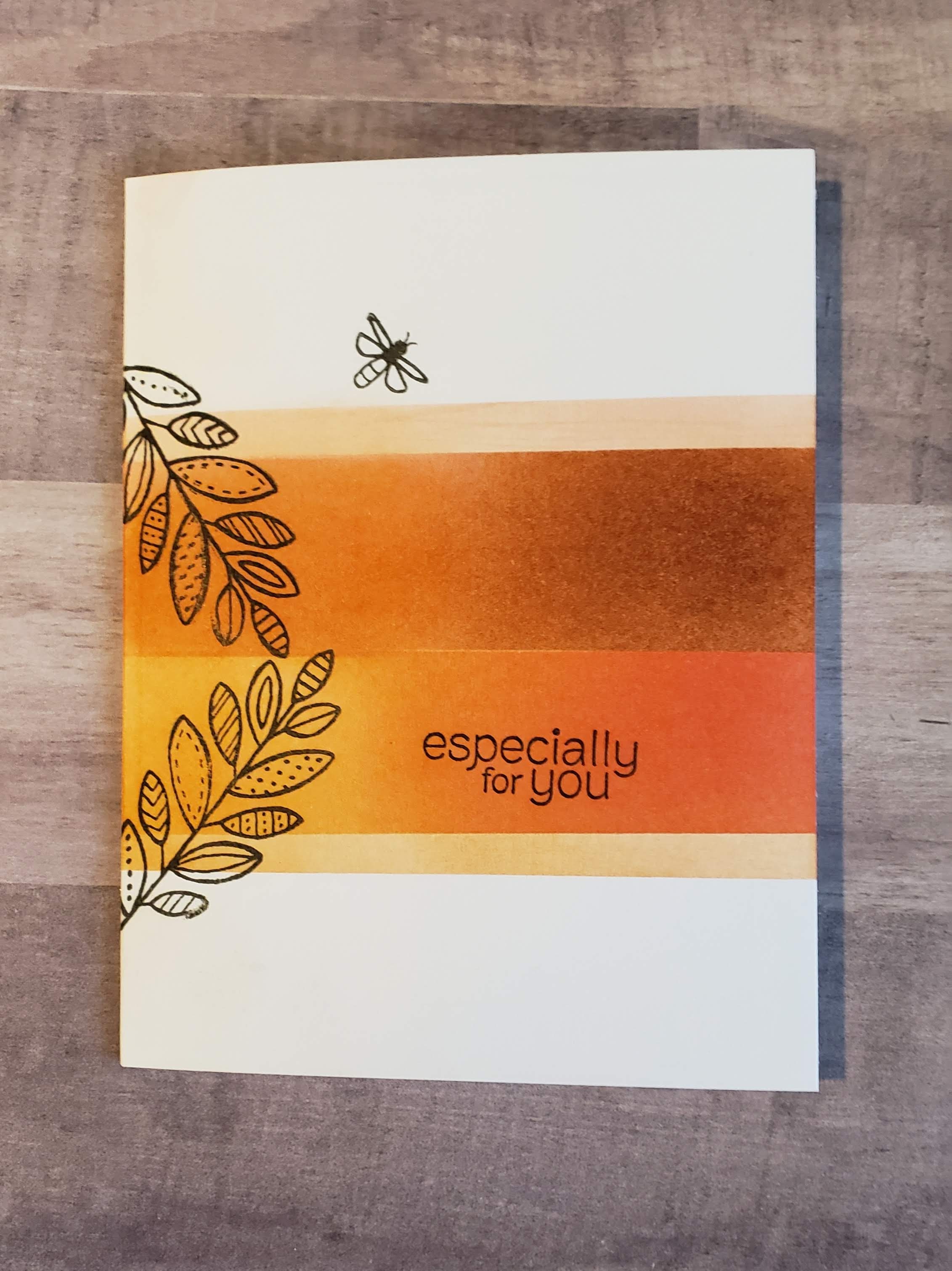First off, you can use Masking Tape to block the areas you don’t want ink on or use a 3×5 Post-it Note like I did. When we are talking straight lines, a Post-It Note works just fine. Anyway, I laid my masks down and did the larger bottom layer, using Pumpkin Pie for the first half and then Poppy Parade for the second half. On the upper layer, I then used Poppy Parade again and then finished it off with Cajun Craze. Kind of hard to explain, but with using the blending brushes and an ink pad, it was easy-peasy. I added the smaller strips because, as usual, I had ink on my fingers and smudged the card when I took off the mask. So I just added to smaller strips to cover my goof.