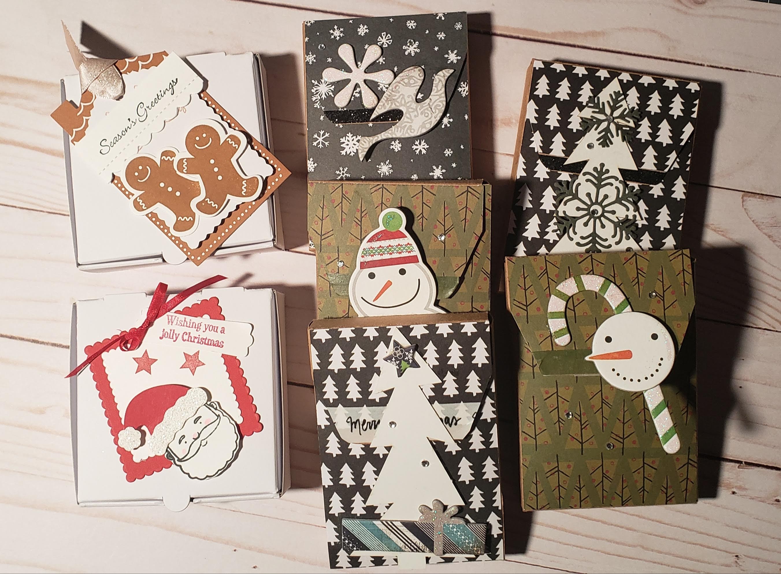 Well, this is the last of my Christmas offerings this year. I had boxes leftover from previous Paper Pumpkins where I never felt the need to actually use them as designed. So, they went into my stash and I decided to pull out a few of them for some quick and easy gifts. I used old Christmas paper and plenty of embellishments I had to make the tall boxes. The other two white pizza boxes were decorated with leftovers from my Christmas cards. Of course, all the boxes were filled with chocolate and will get into the hands of the recipients by Christmas morning.