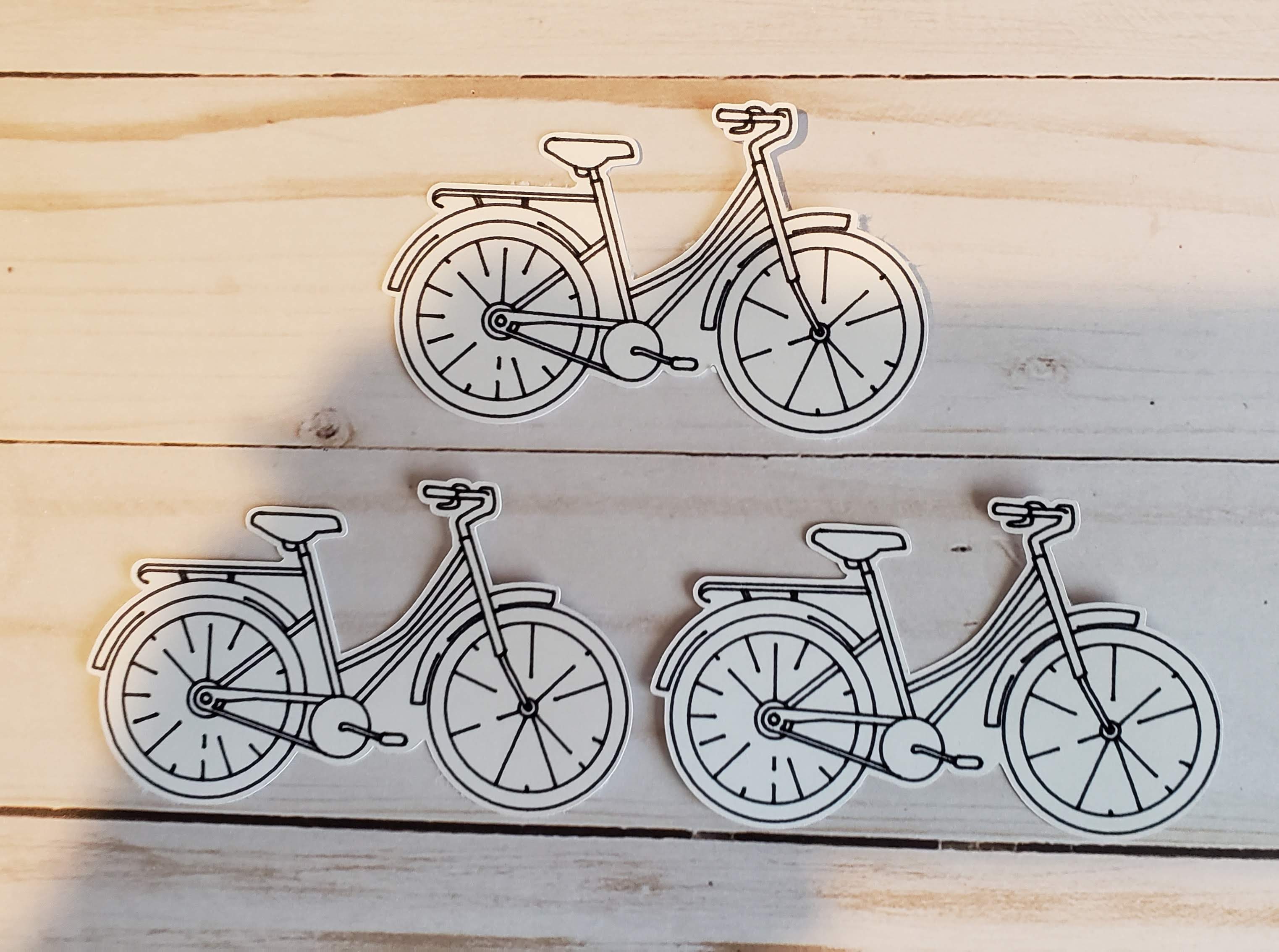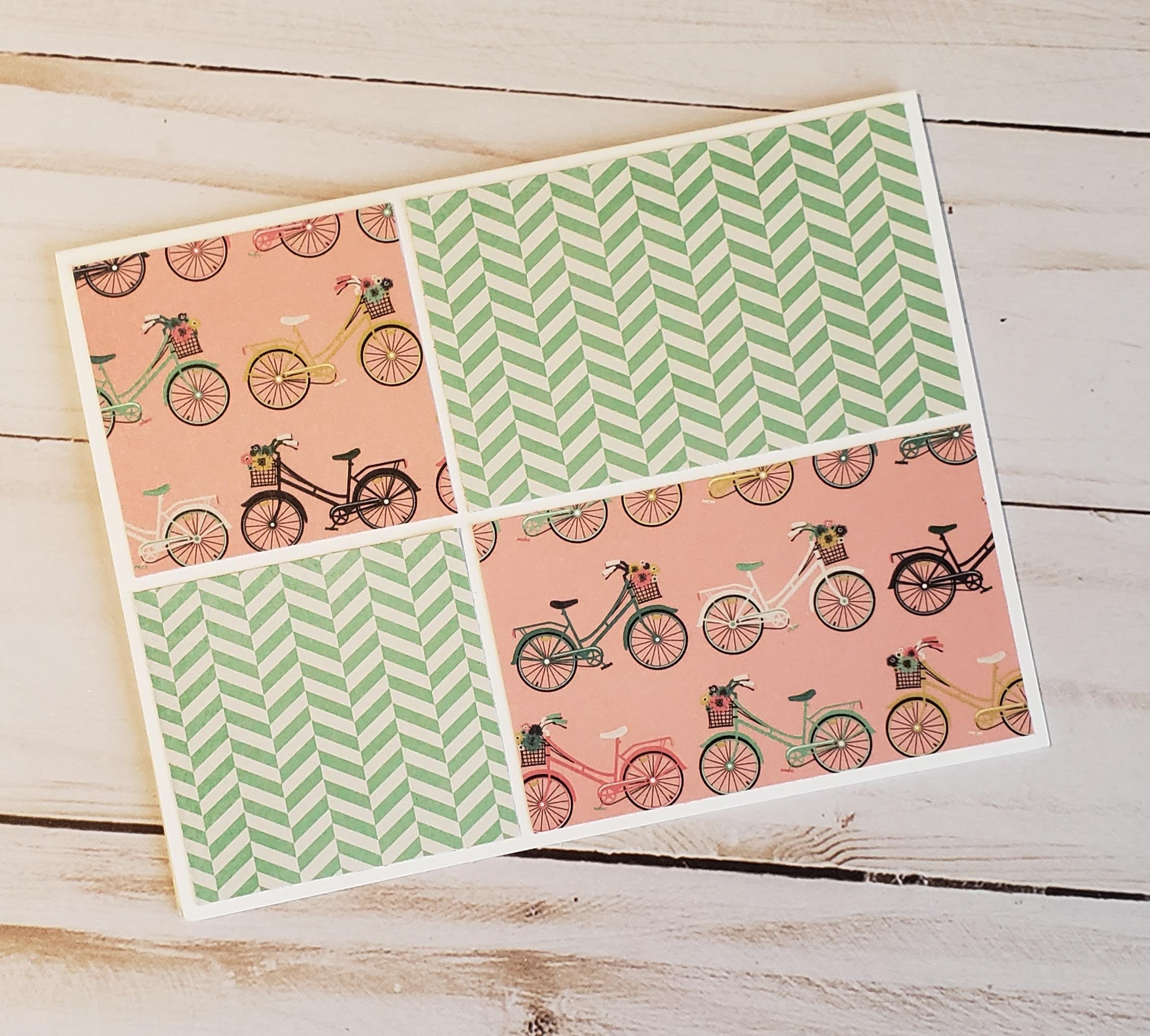 I started with a white card base and then attached my pieces of paper. The small squares measure 2 x 2 and the larger rectangles measure 3-1/4 x 2. I then headed to the Cricut to decide on my bicycle.