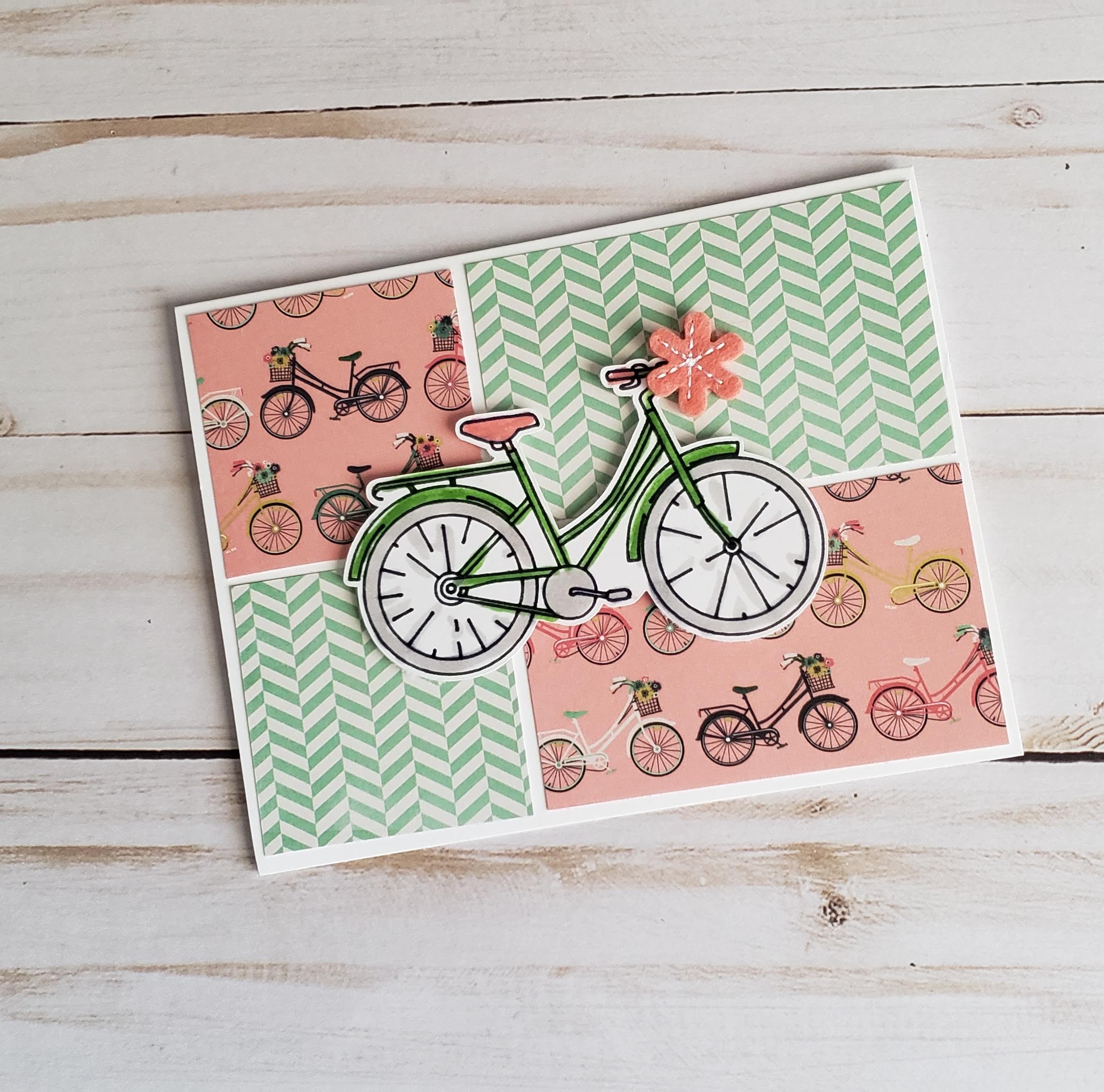 Love the bicycle! And of course, green and pink is one of my favorite color combinations! Great card!