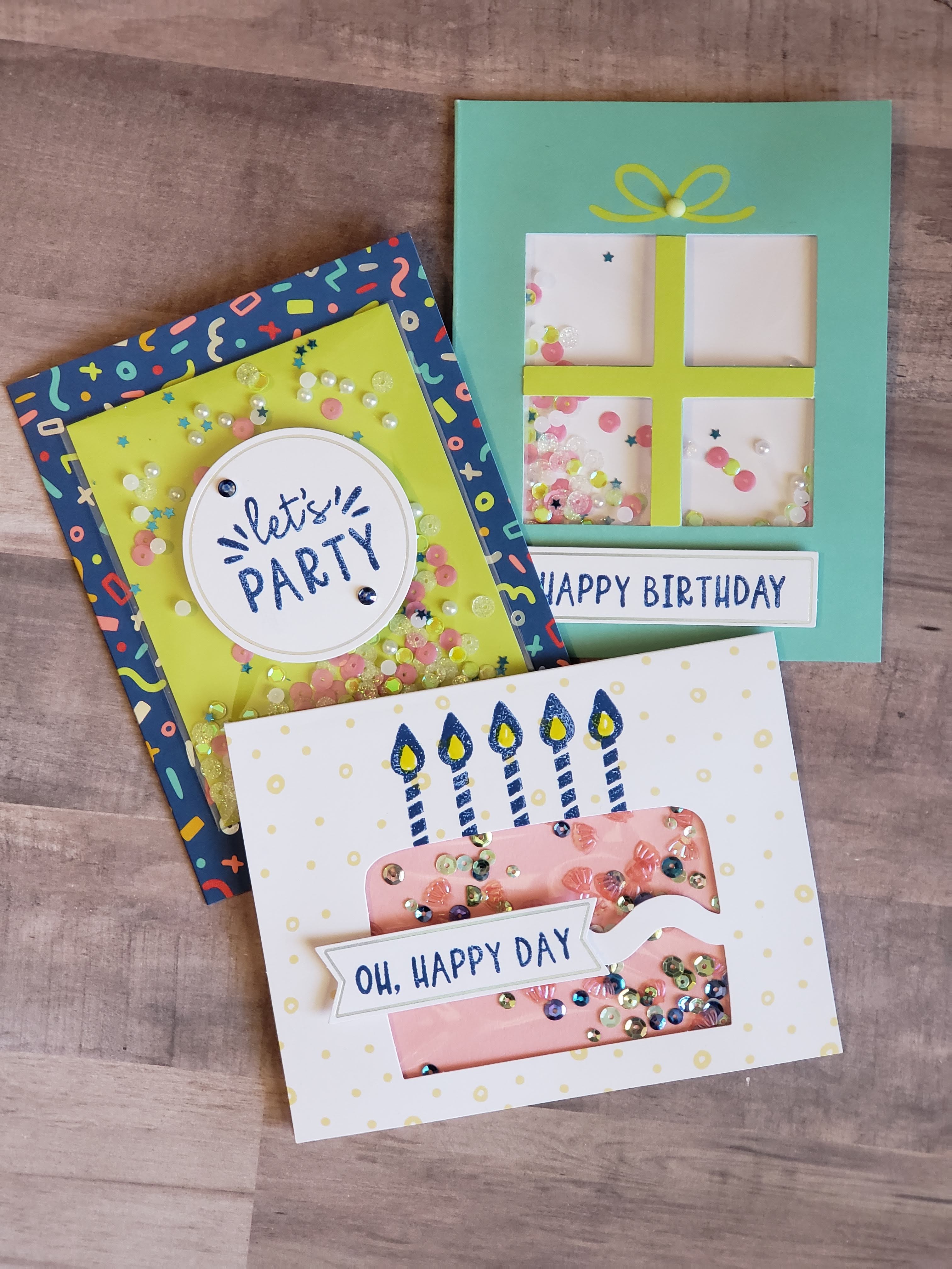 I didn’t like the way the clear envelope that contained the shaker elements shown on the back of the front of the card, so I covered them with coordinating cardstock. I also felt the need to add a little bit more of the shaker elements to the cards, and on the birthday cake card, I went to my stash and used the retired Whale of a Time Sequins to finish it.